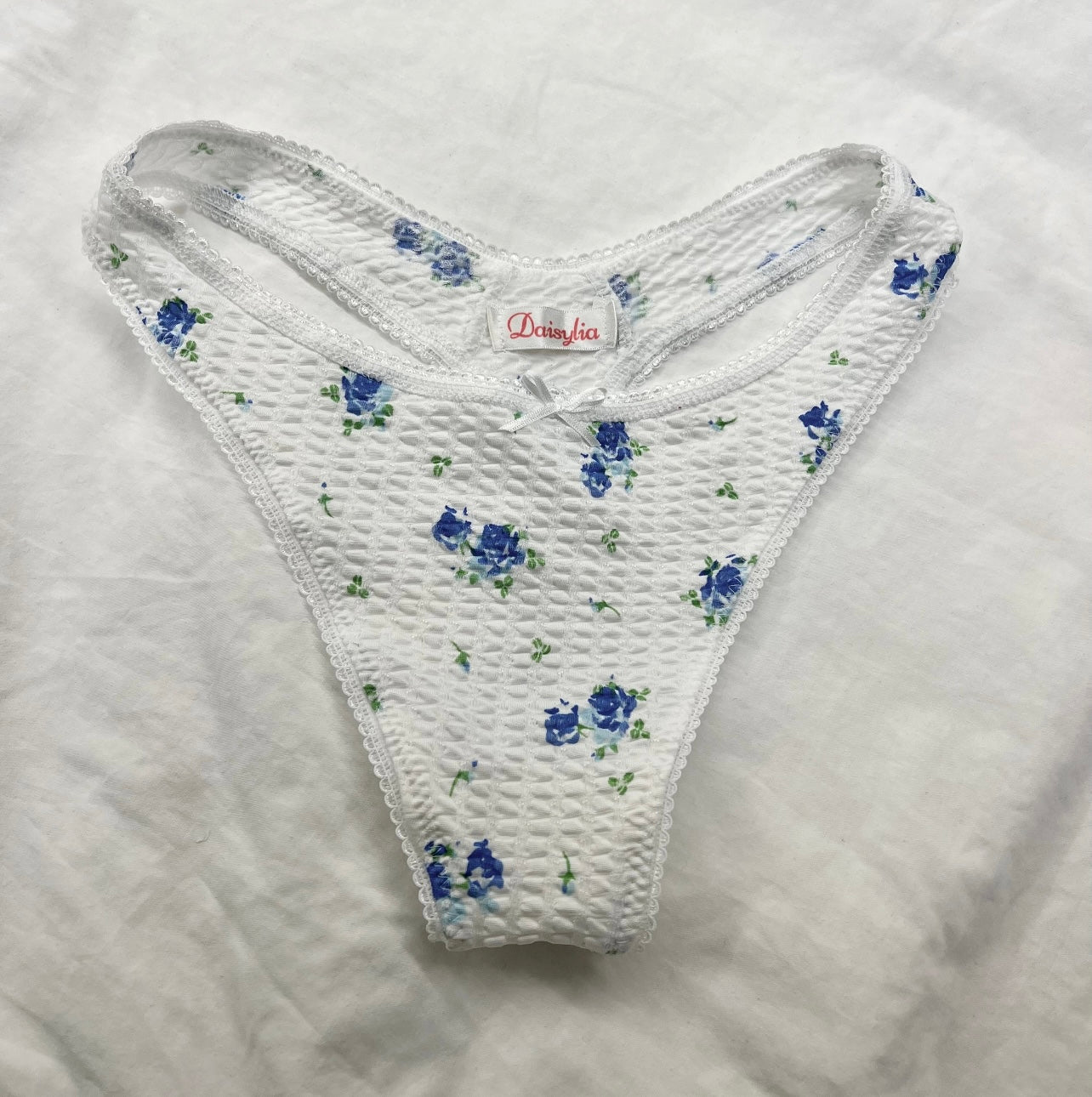 Blueberry Muffin Ivie Thong. Blue floral printed jacquard double jersey fabric. Lace elastic, detailed straps and white bows. Standard rise thong