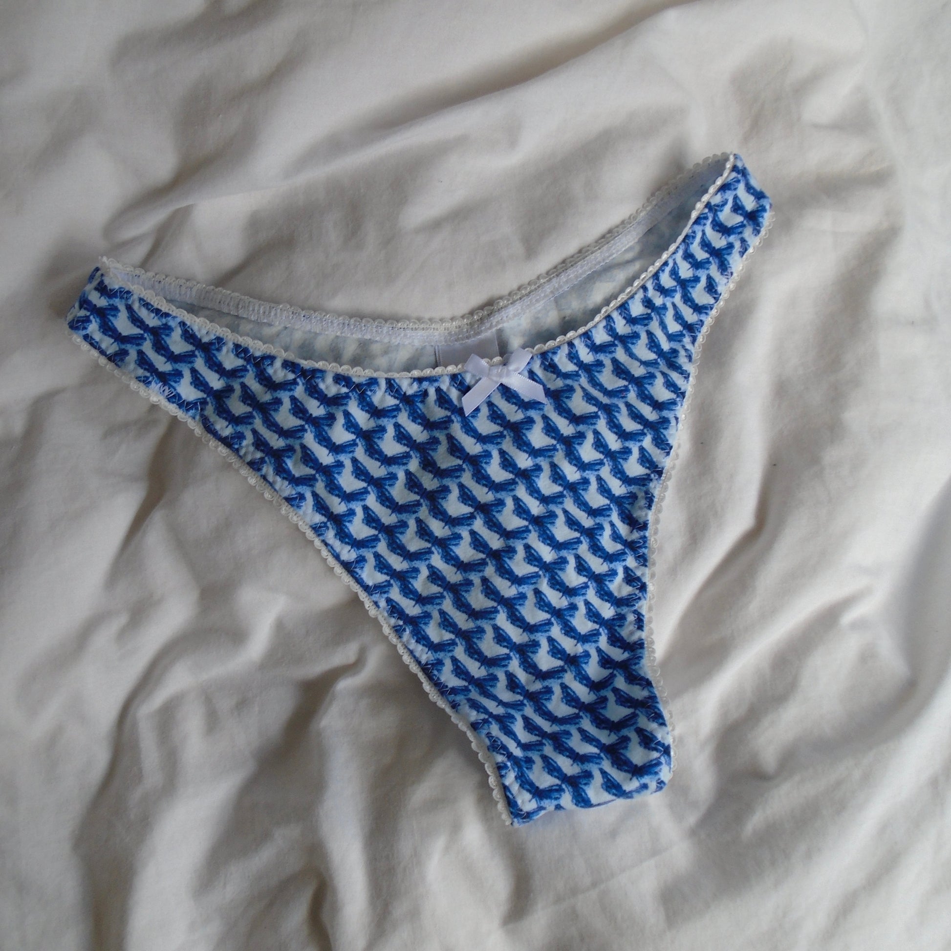 Blue Butterfly printed cotton jersey fabric with white bows and elastic. Extremely limited amount of fabric, will not be available again. Standard rise, medium coverage knicker.