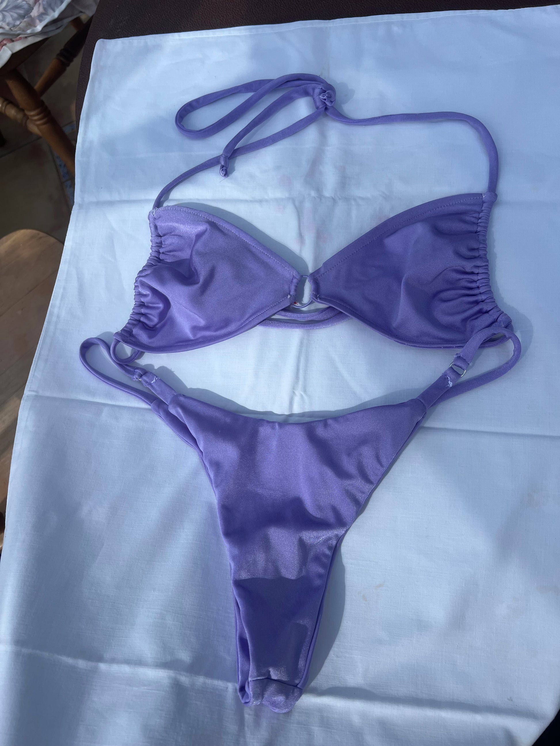 Aura Bikini Top. Aqua blue shimmer double layered fabric elastic ring in centre. The top ties at the back and neck.