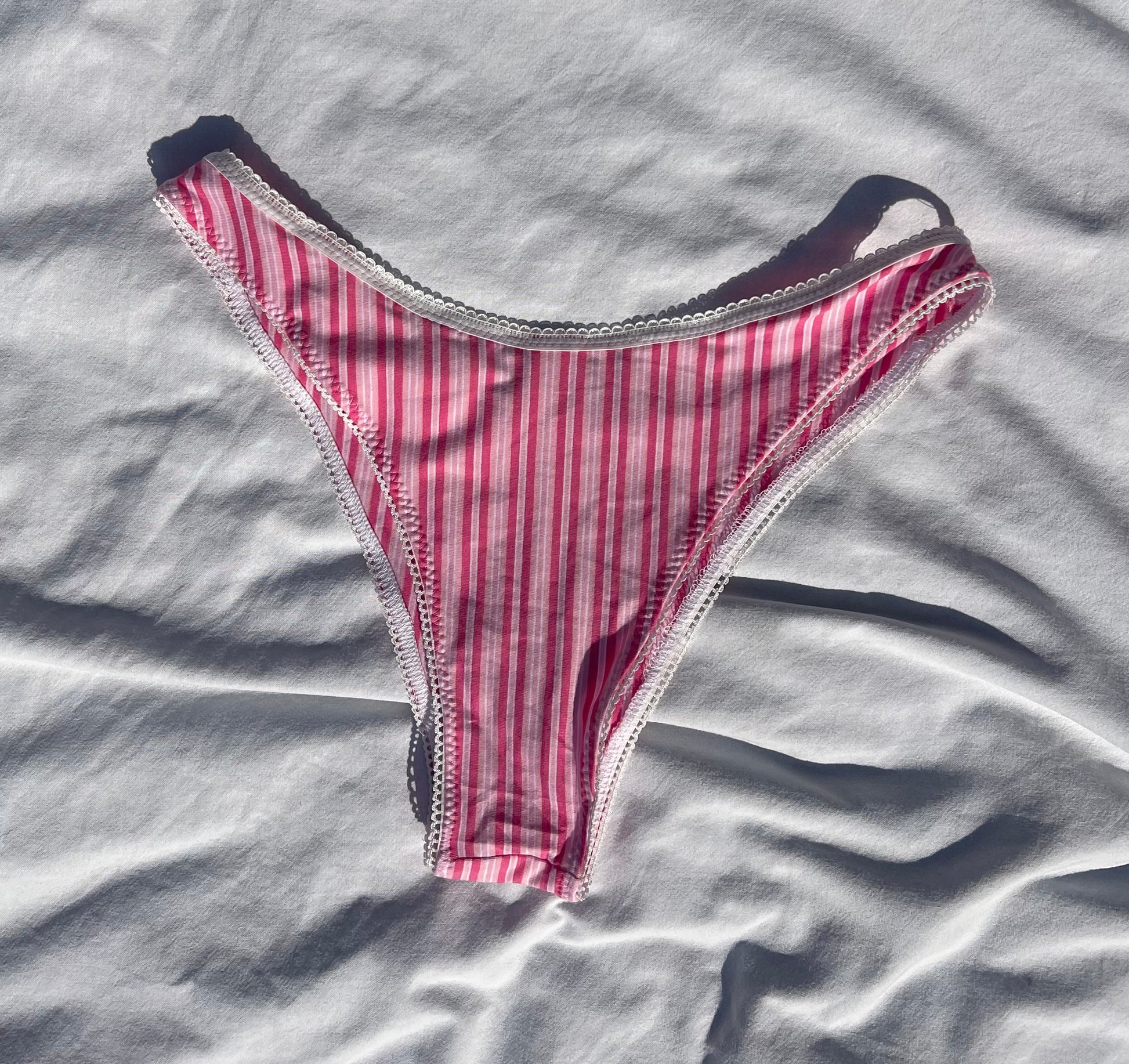 Berry Twist Gracie knicker. Tanga style of knickers. Pink striped cotton jersey, white lace&picot elastic and white bow.  If in between sizes recommended to size down with this fabric.
