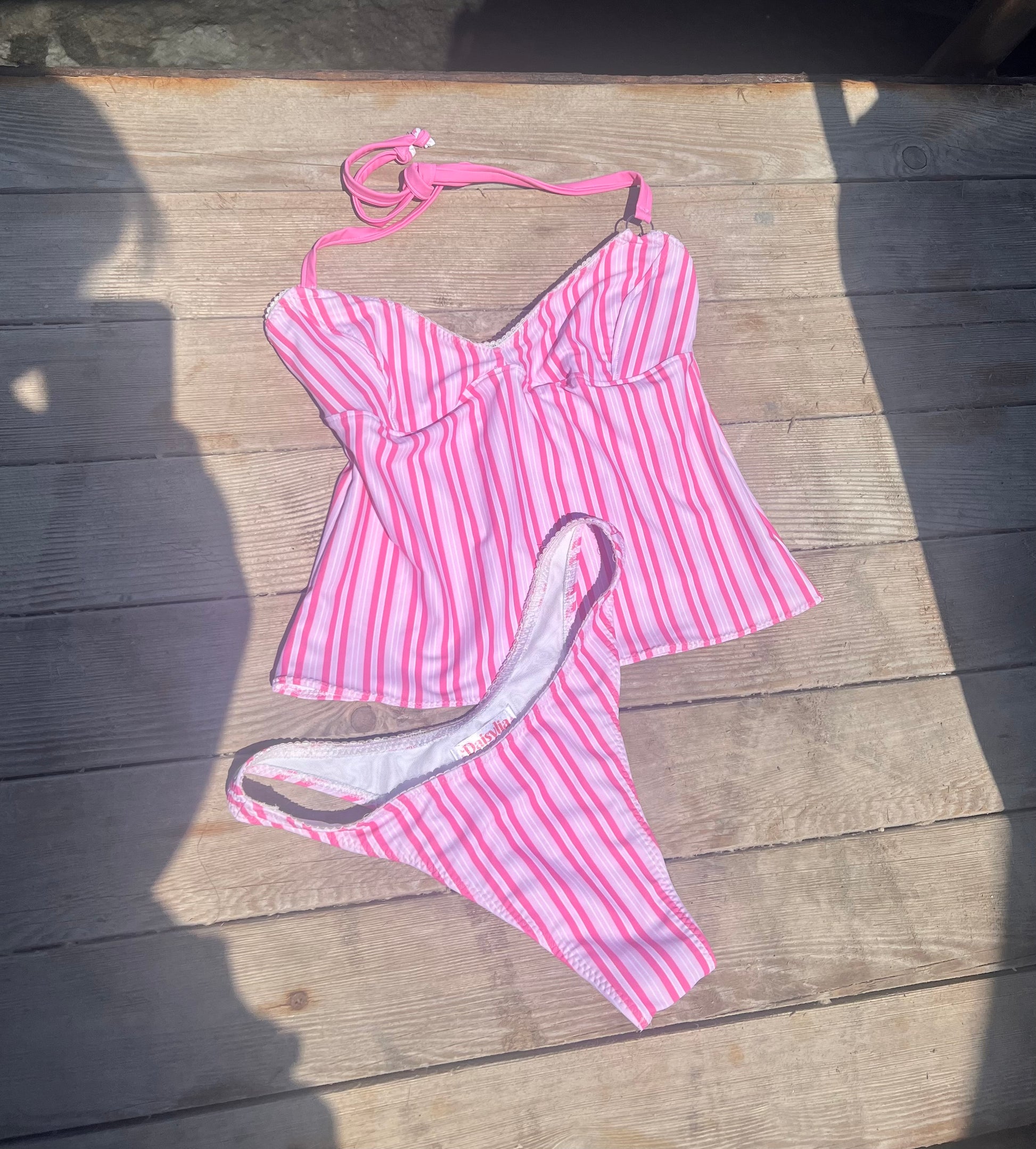 Berry Twist - Tankini Top. Pink and white stripes with pink straps. This halter top ties at the back to adjust to a fit best for you. Matching Bottoms available. Also available in the standard bikini top. Cotton Arabella Halter top, Gracie Knicker & Ivie Thong.