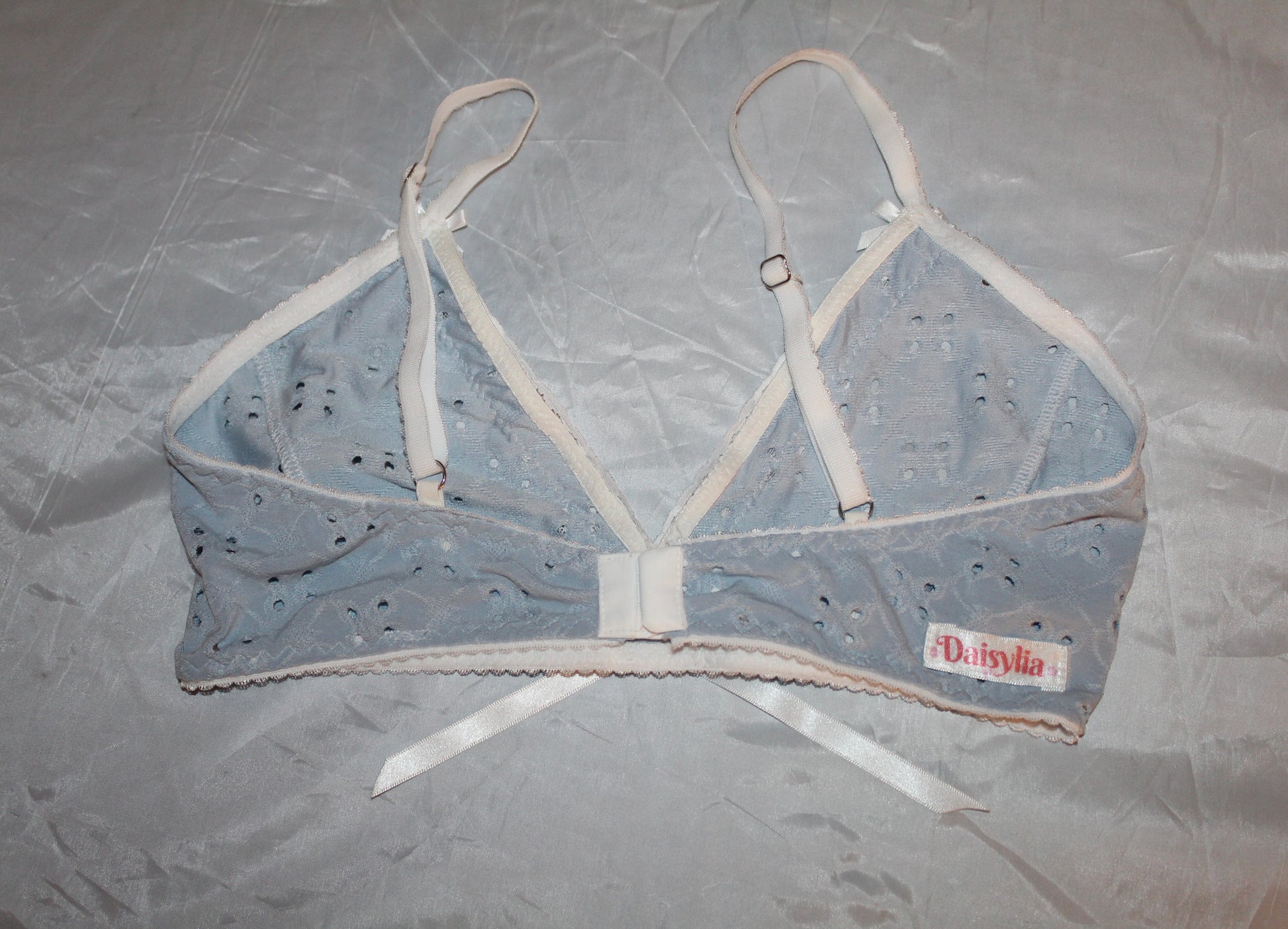 Blue Eyelet Bralette. Blue Eyelet fabric with lace, white bows and elastic. Adjustable straps and back.