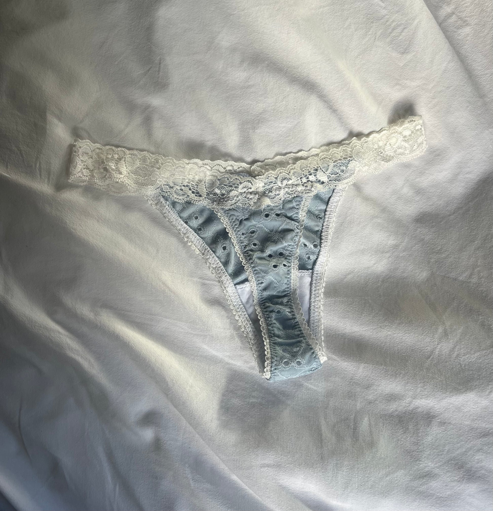 Blue Broderie - Elsie Thong. Baby blue Broderie stretch jersey fabric, white lace, elastic, bows. (Size guide follows bellow).