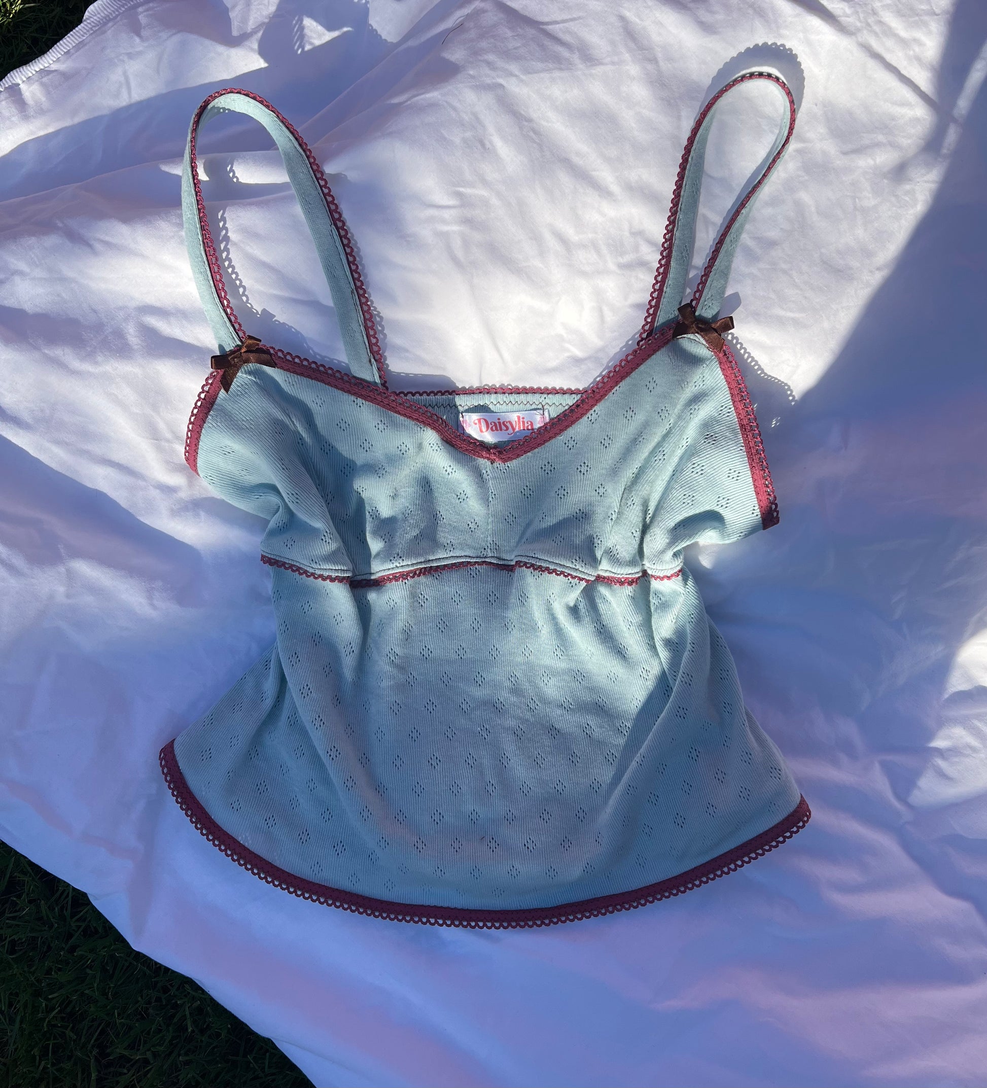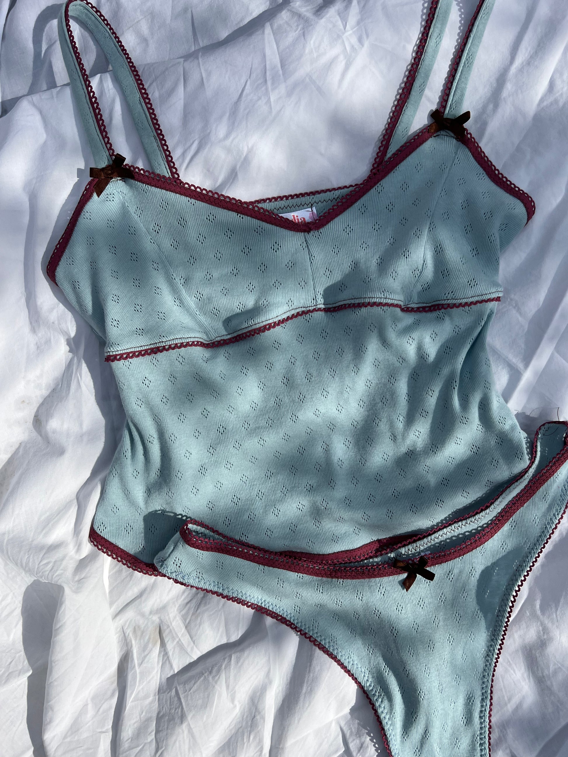 This cami is made out of pretty blue pointelle stretch jersey fabric with mauve picot edge elastic and brown bows.  Label on the side.