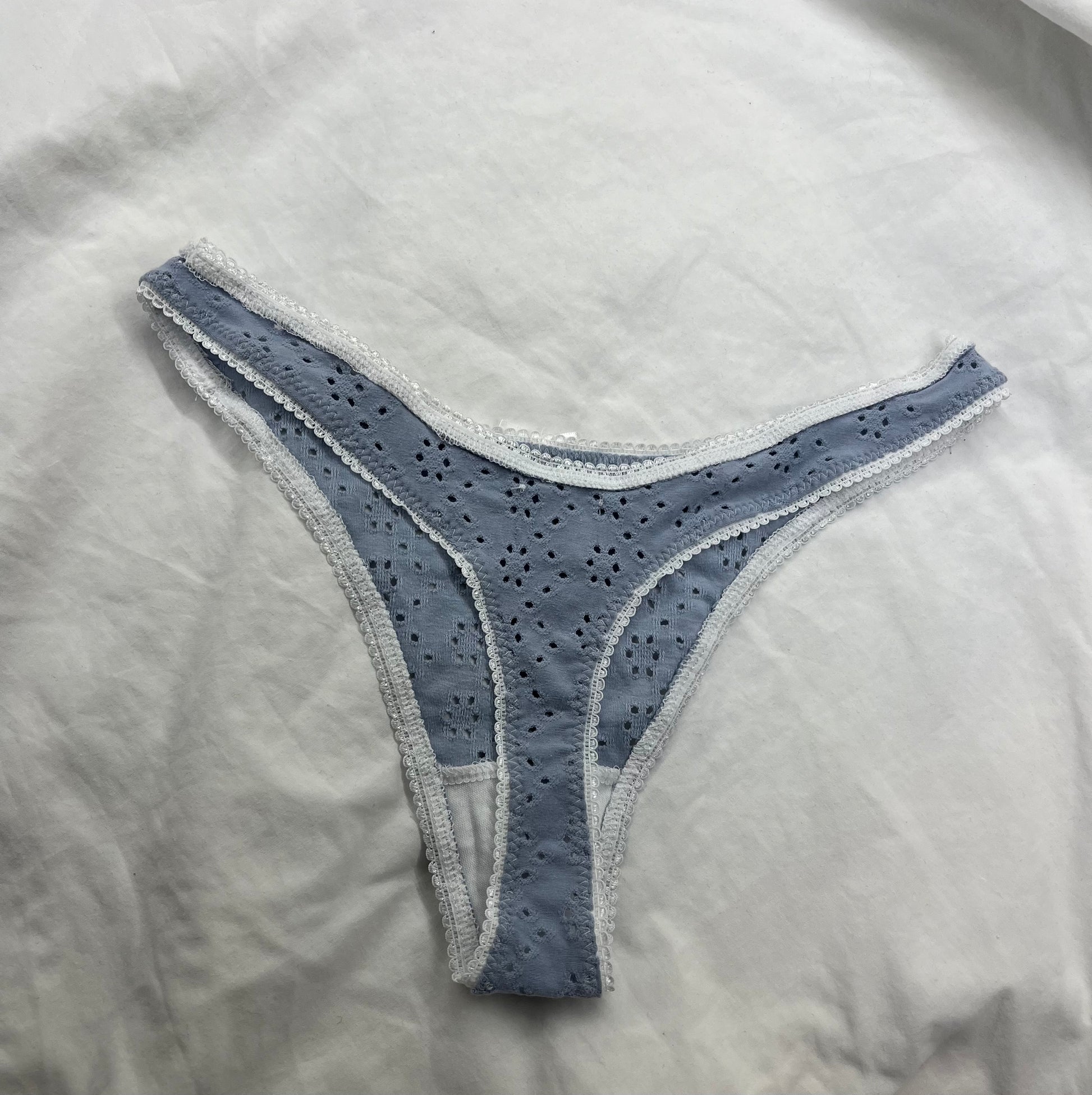 Blue Broderie Ivie Thong. Blue soft comfortable jersey , white elastic and bow. Standard Thong cut. Back shown in image 2 in the Pink Flowers Eyelet Thong.
