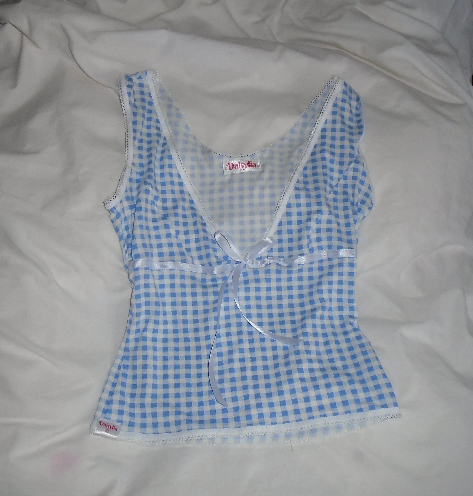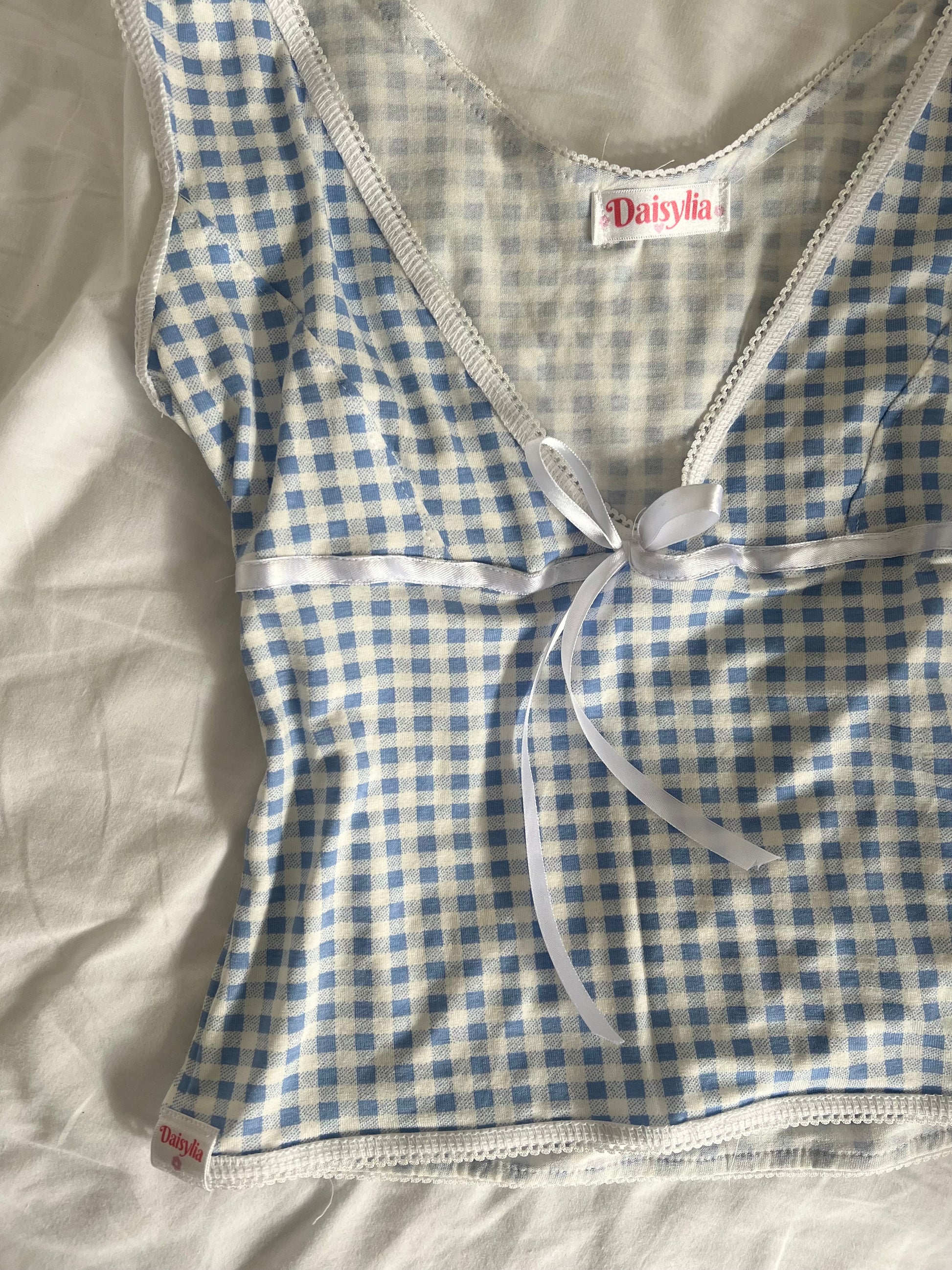 The Alice Top is a V neck vest top made from deadstock Blue Gingham cotton jersey stretch fabric. White elastic and a cream ribbon bow.