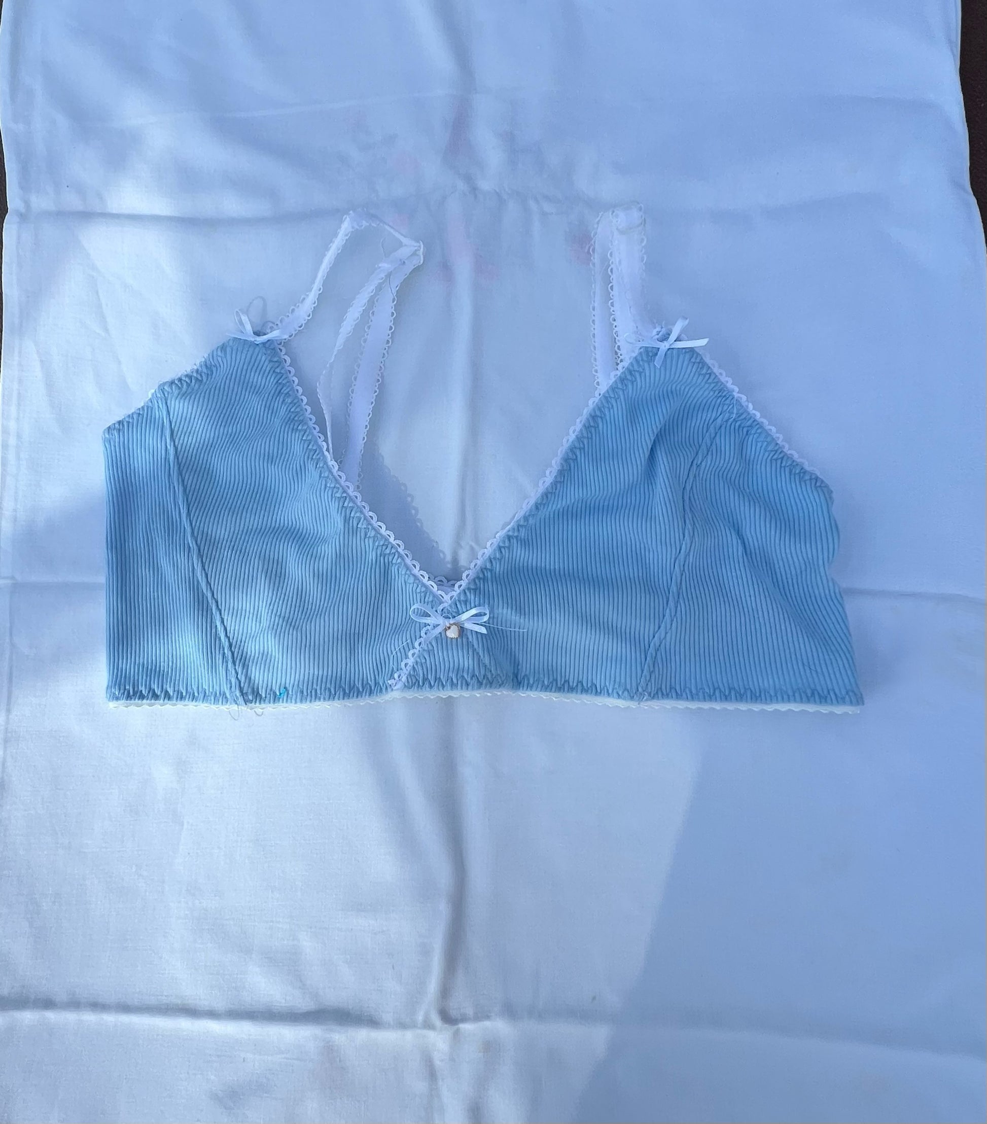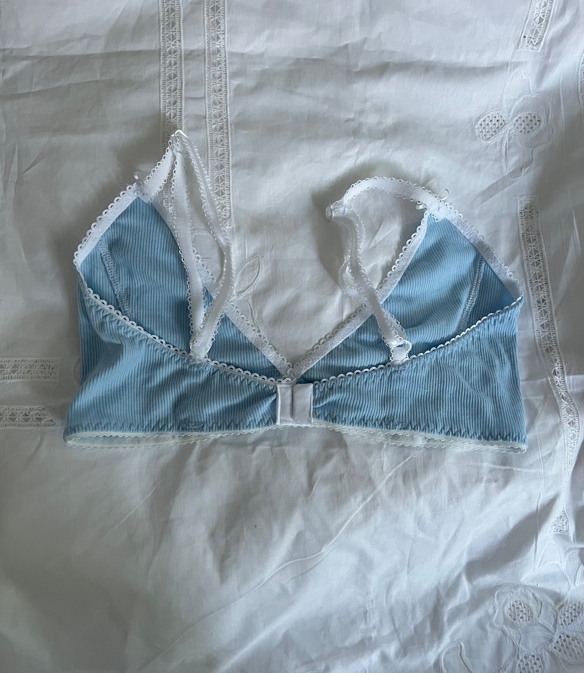 The Blueberry Bralette. Ribbed Jersey with white elastic, bows. Adjustable straps and back. Label on the side.
