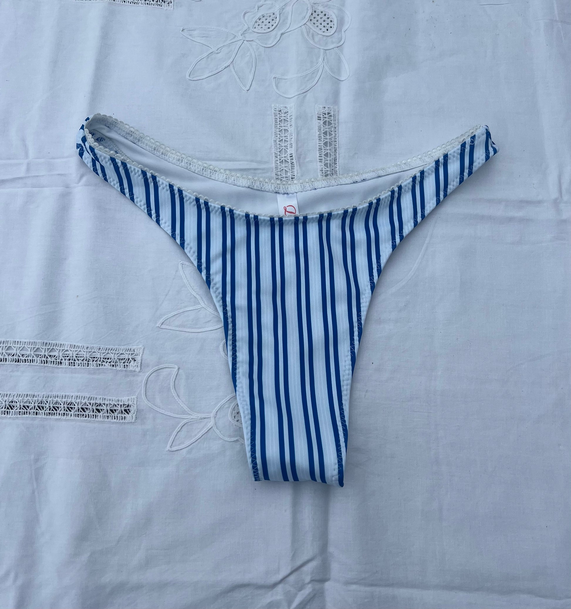 Blueberry Breeze - Bikini Bottoms. Blue striped fabric with blue straps, white elastic. Tanga cut of bottoms.
