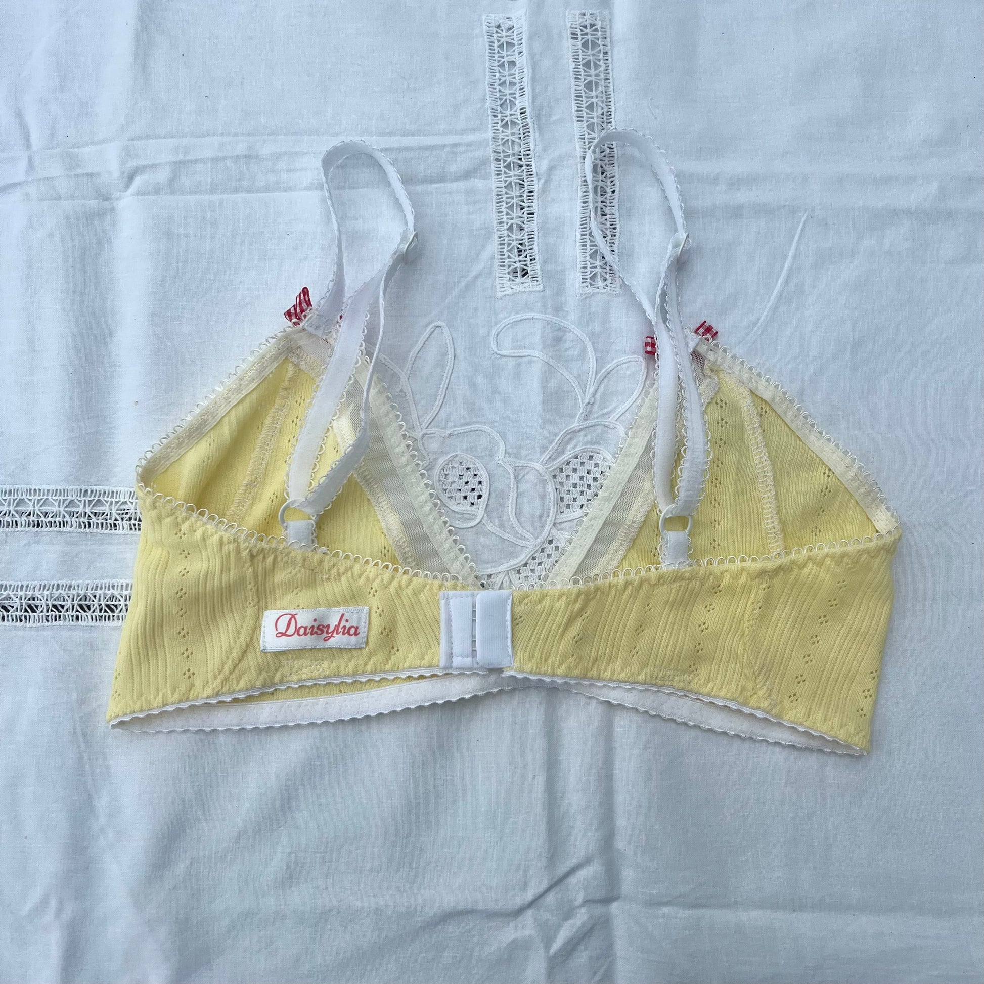 Buttermilk Bralette.Warm lemon striped 100% cotton pointelle with white mesh and picot edge elastic, red gingham bows and charm. Adjustable straps, adjustable back. Label on the side. Optional custom back size.