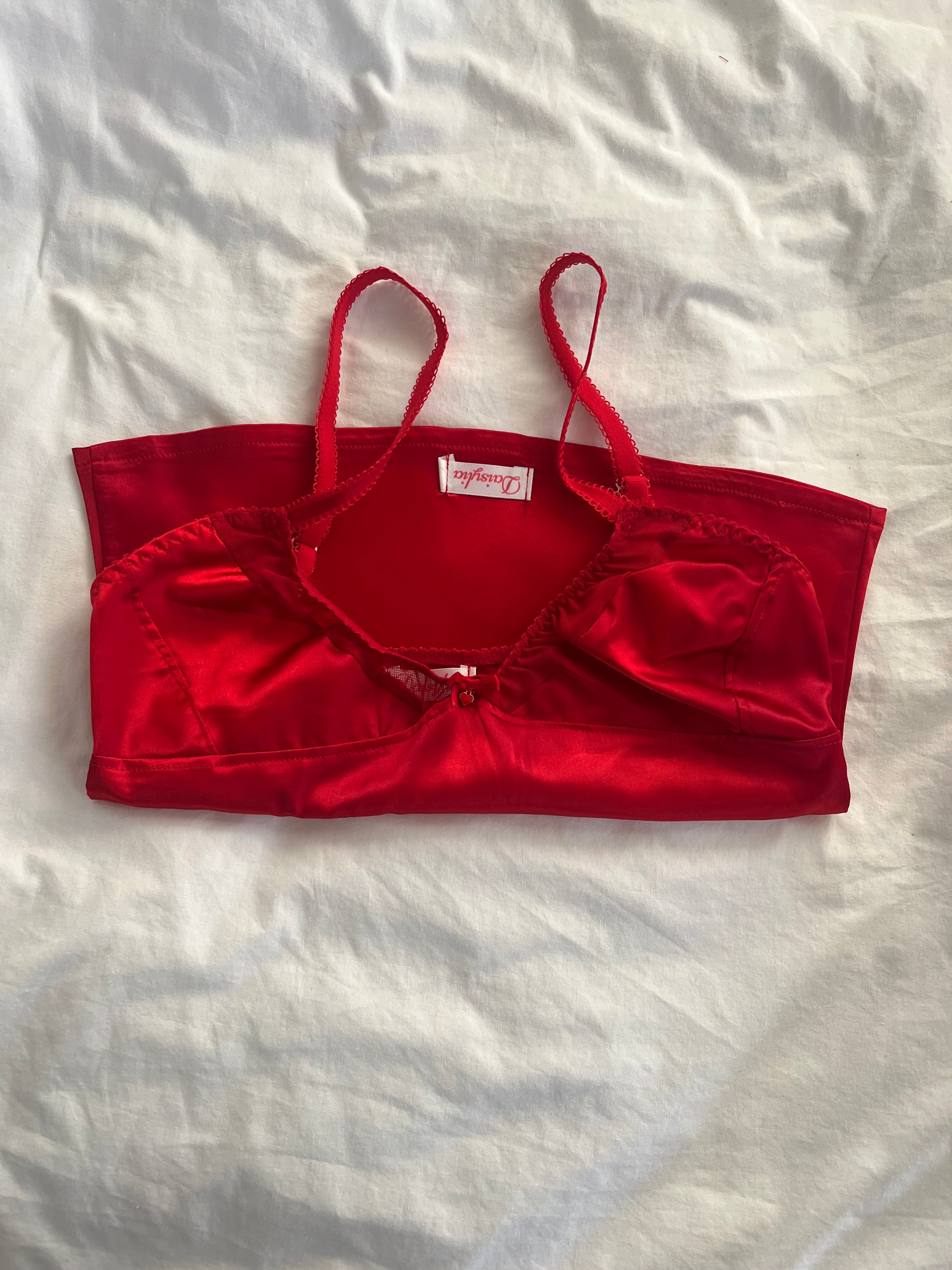 Ruby Isabella Top. She can be dressed up or down, this cami is made out of red satin and mesh fabric with red elastic, stitching, bow with a heart charm. Straps are adjustable.