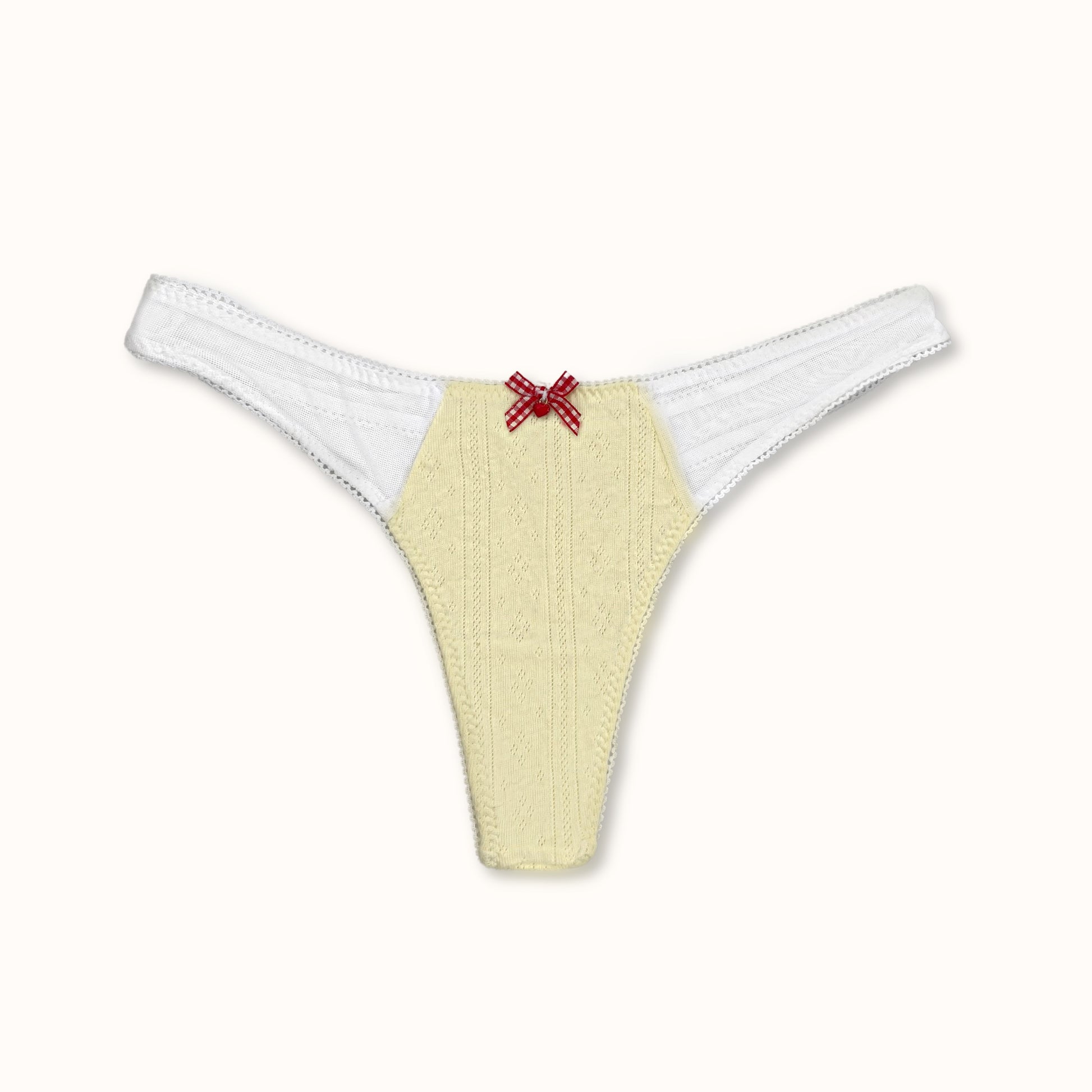 Harmony Ivie Thong. Lemon soft comfortable pointelle jersey pointelle and white mesh with red gingham bow. Standard rise of thong.