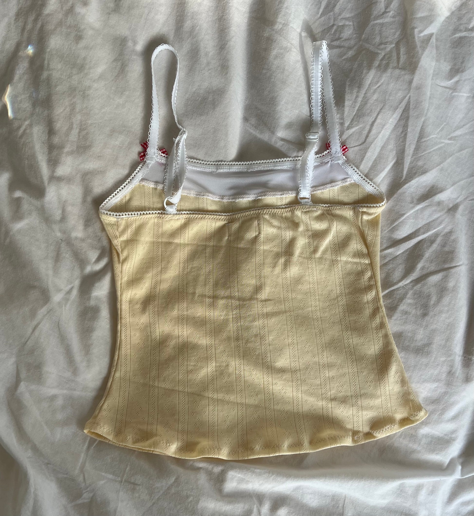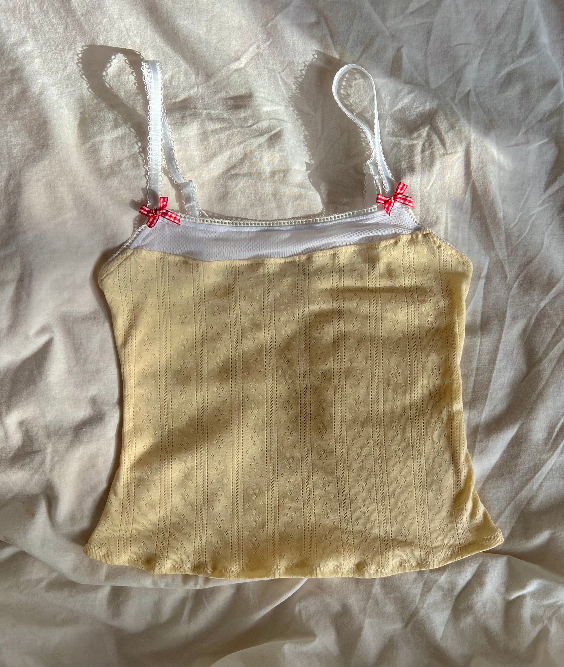 Buttermilk Julie Top. Warm lemon striped pointelle with white mesh and picot edge elastic, red gingham bows. Adjustable straps, double layered with plain 100% cotton jersey fabric for comfort and support.