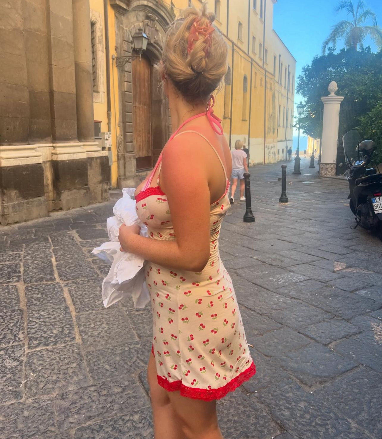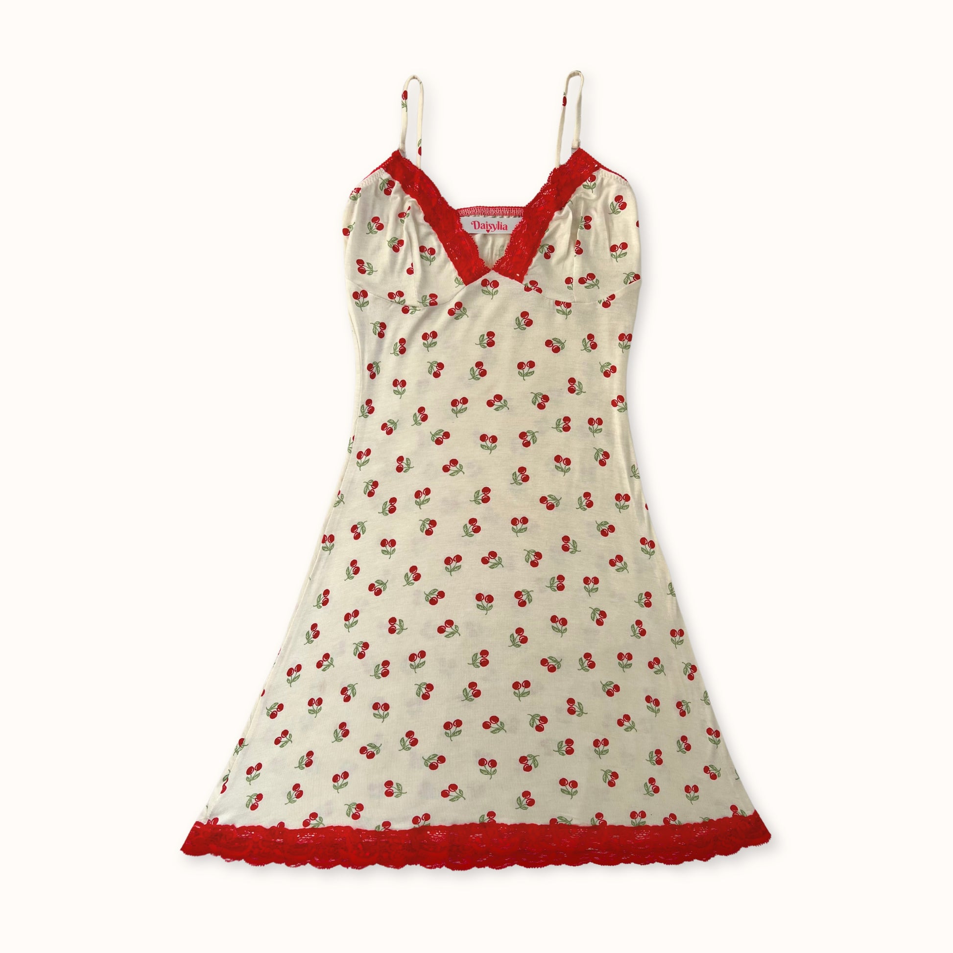 Cherry Glaze Dream Dress. Cream comfortable soft Jersey fabric with cherry print, red lace. Perfect to be comfortable in at home, sleep in, wear as a summer day dress or bikini cover up.