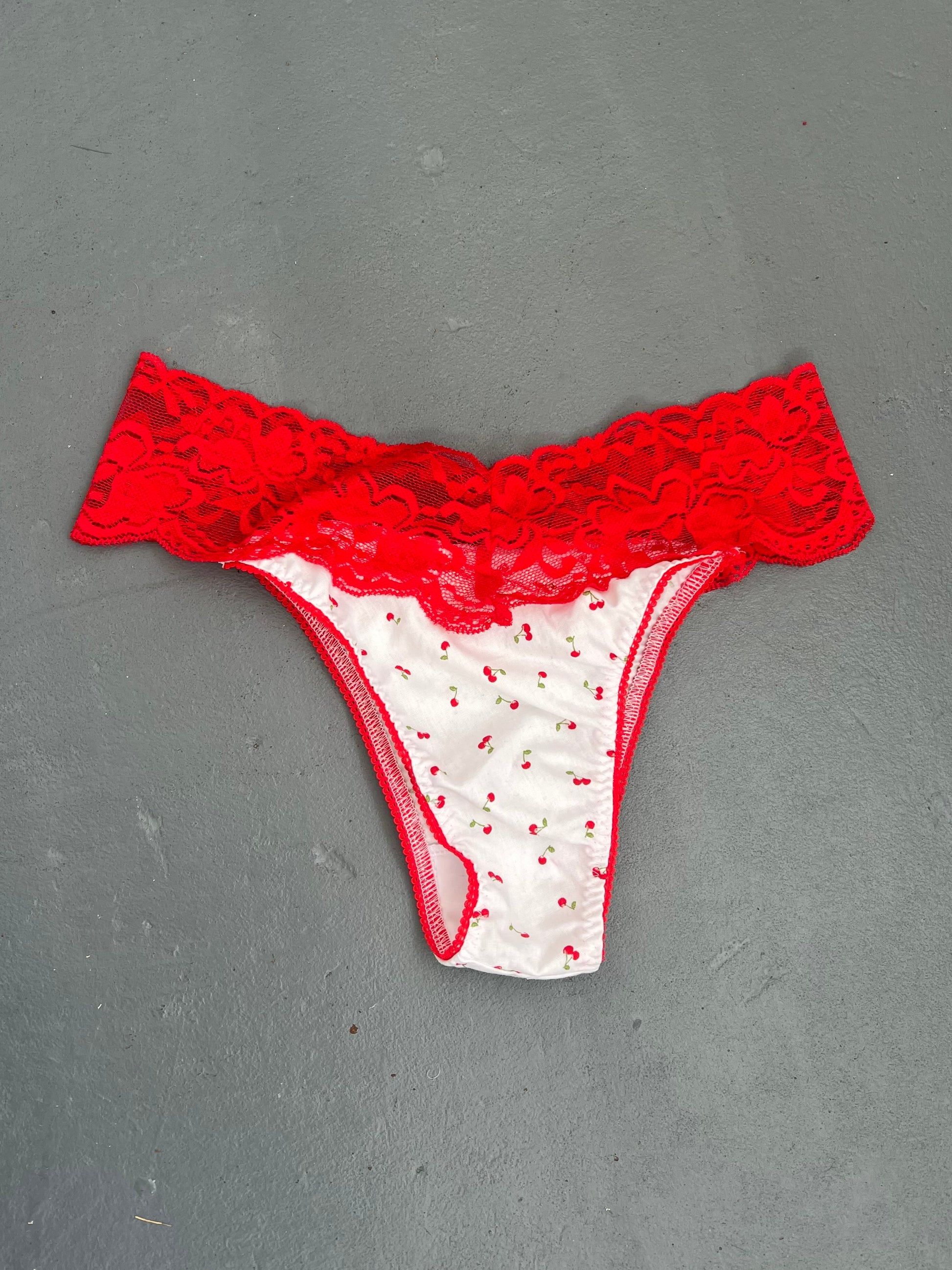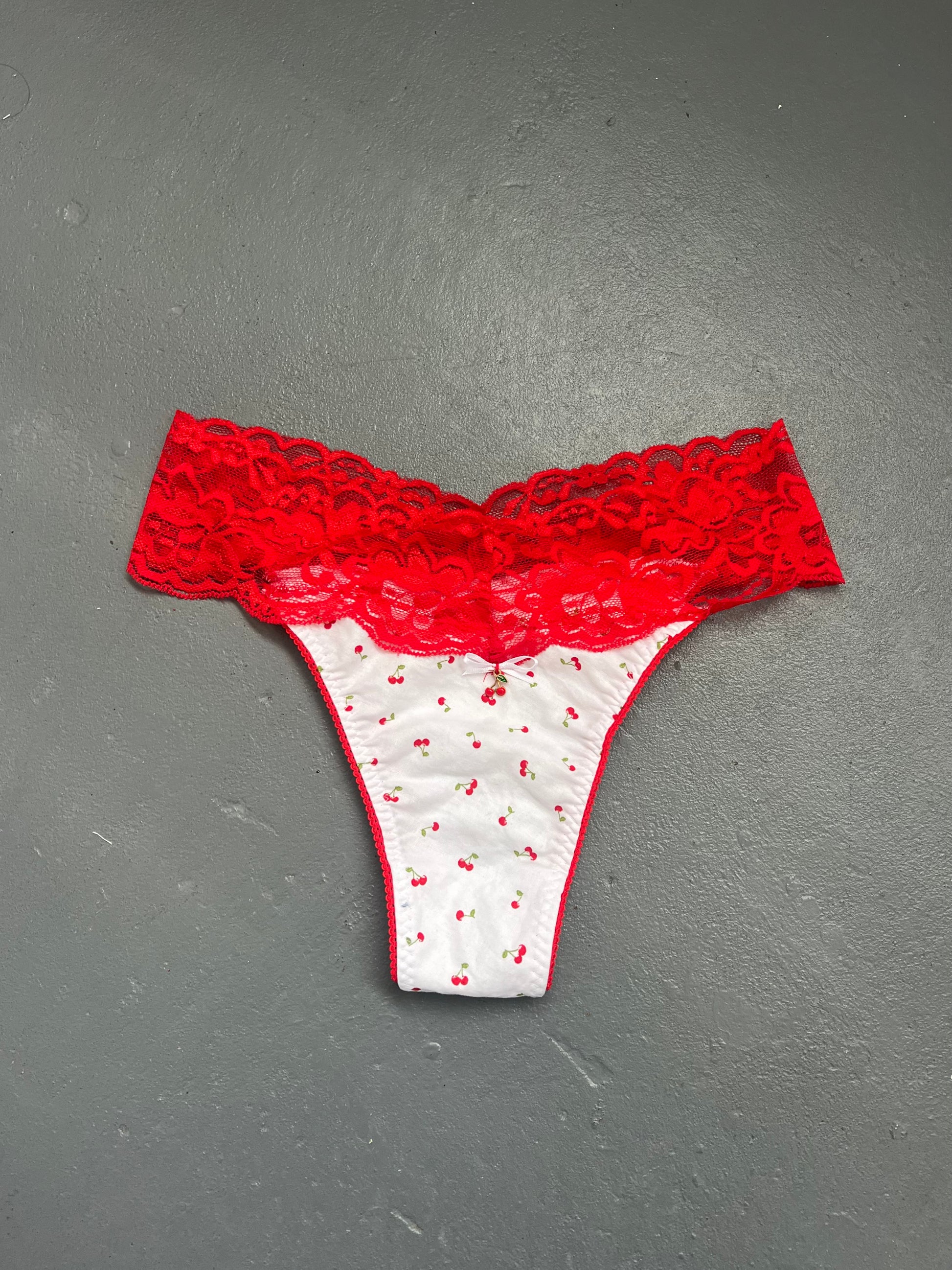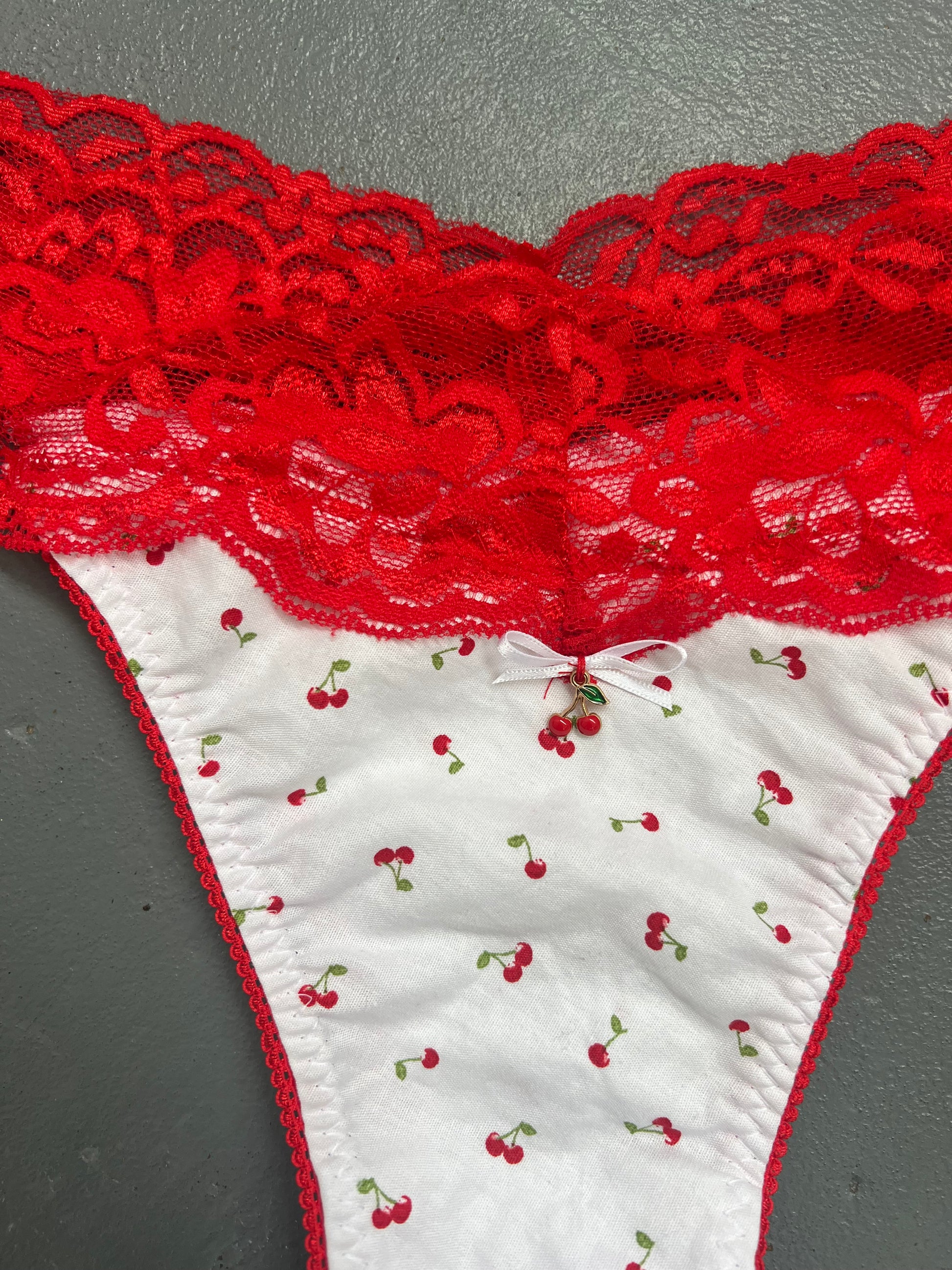 Cherry Lillie Knicker. White cherry printed 100% cotton, red elastic and bow with cherry charm.