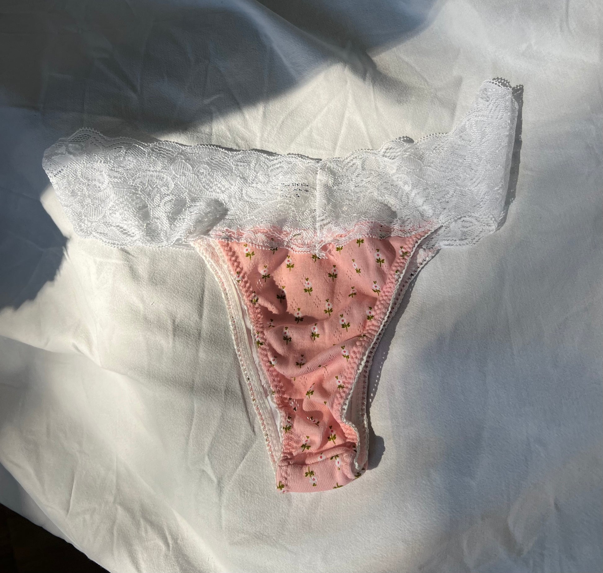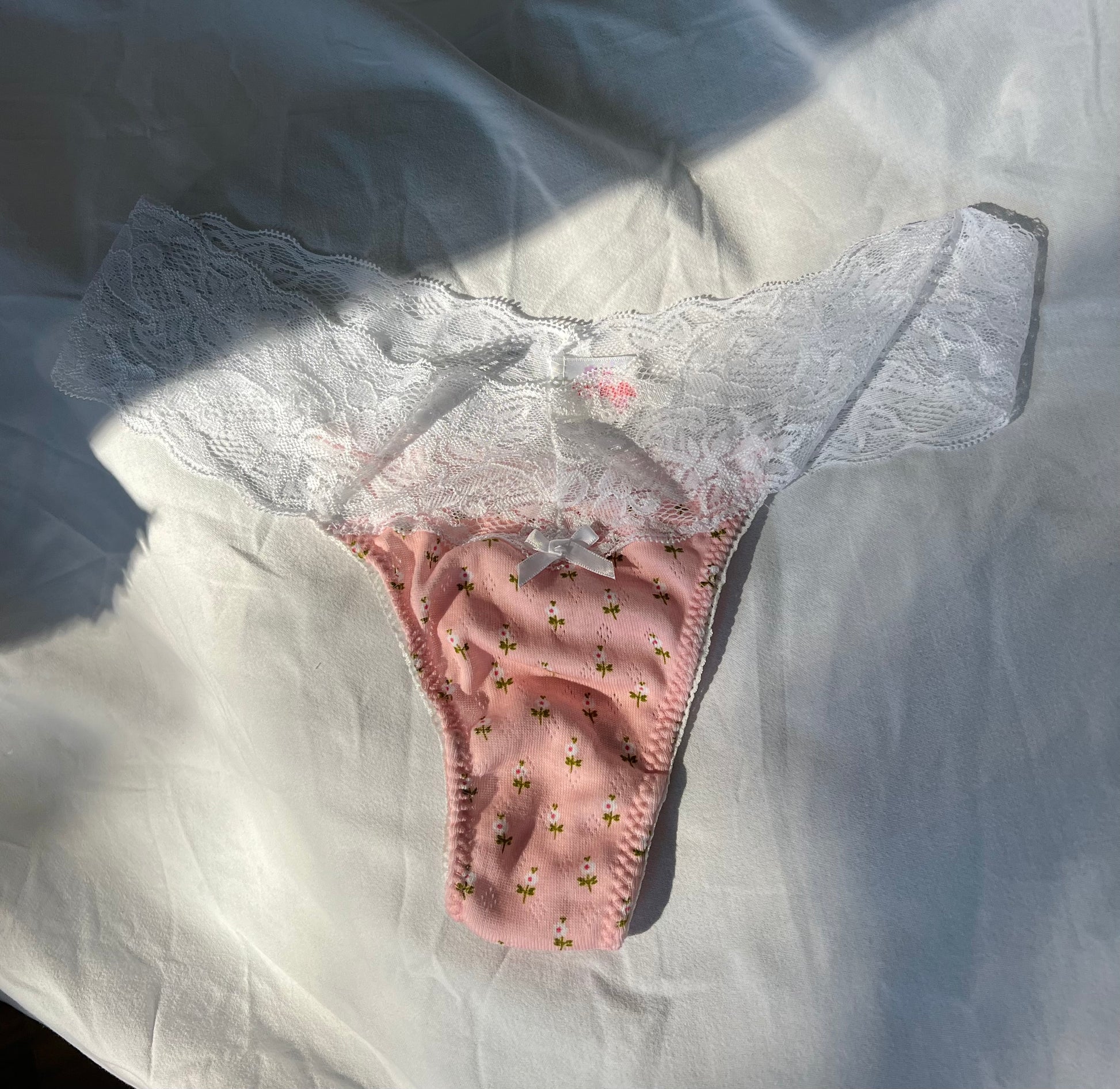 Cherry Vanilla Lillie Knicker. Pink comfortable flower printed pointelle jersey with white lace hip, white elastic and a white bow. Tanga cut of Knicker.