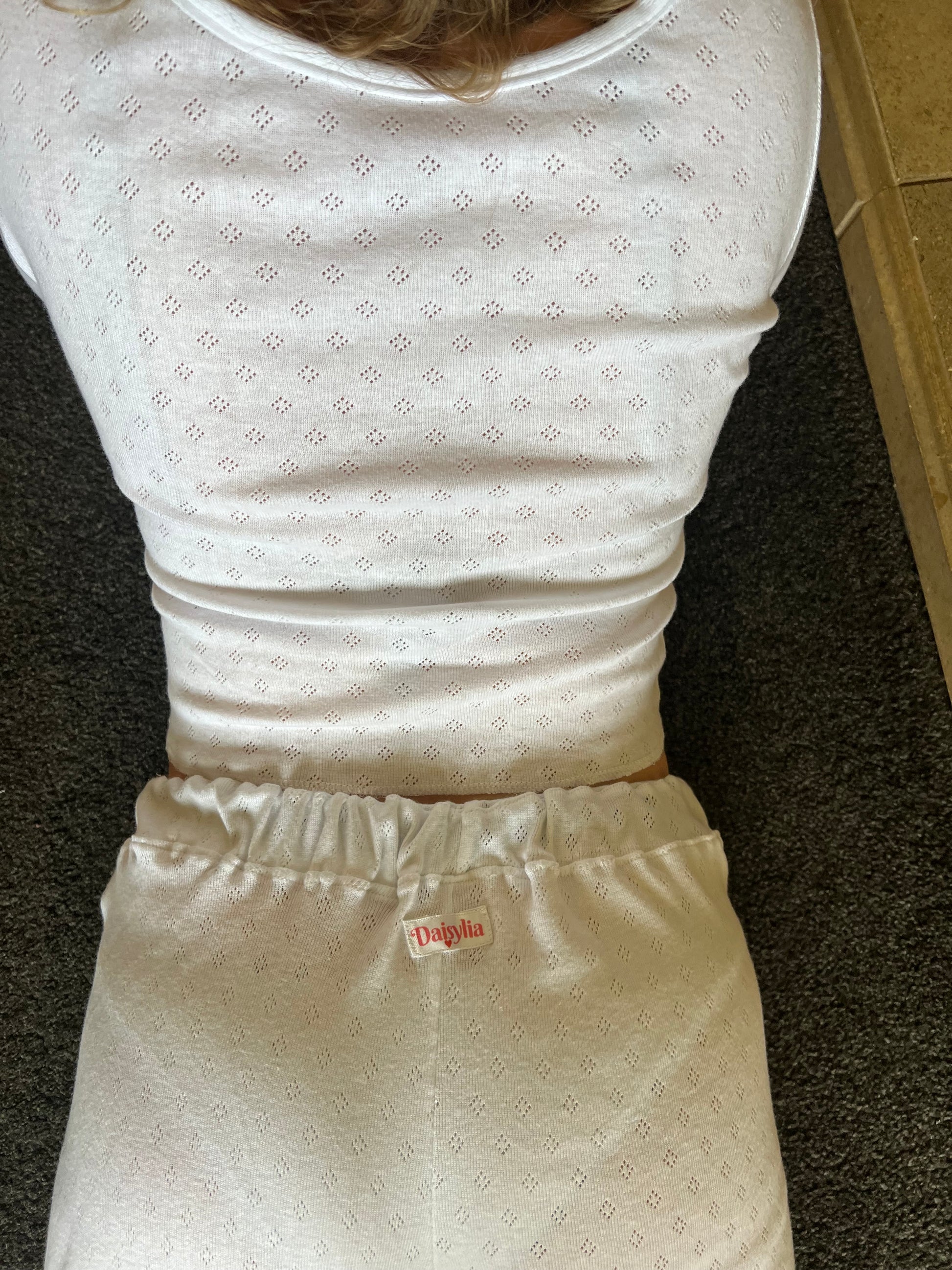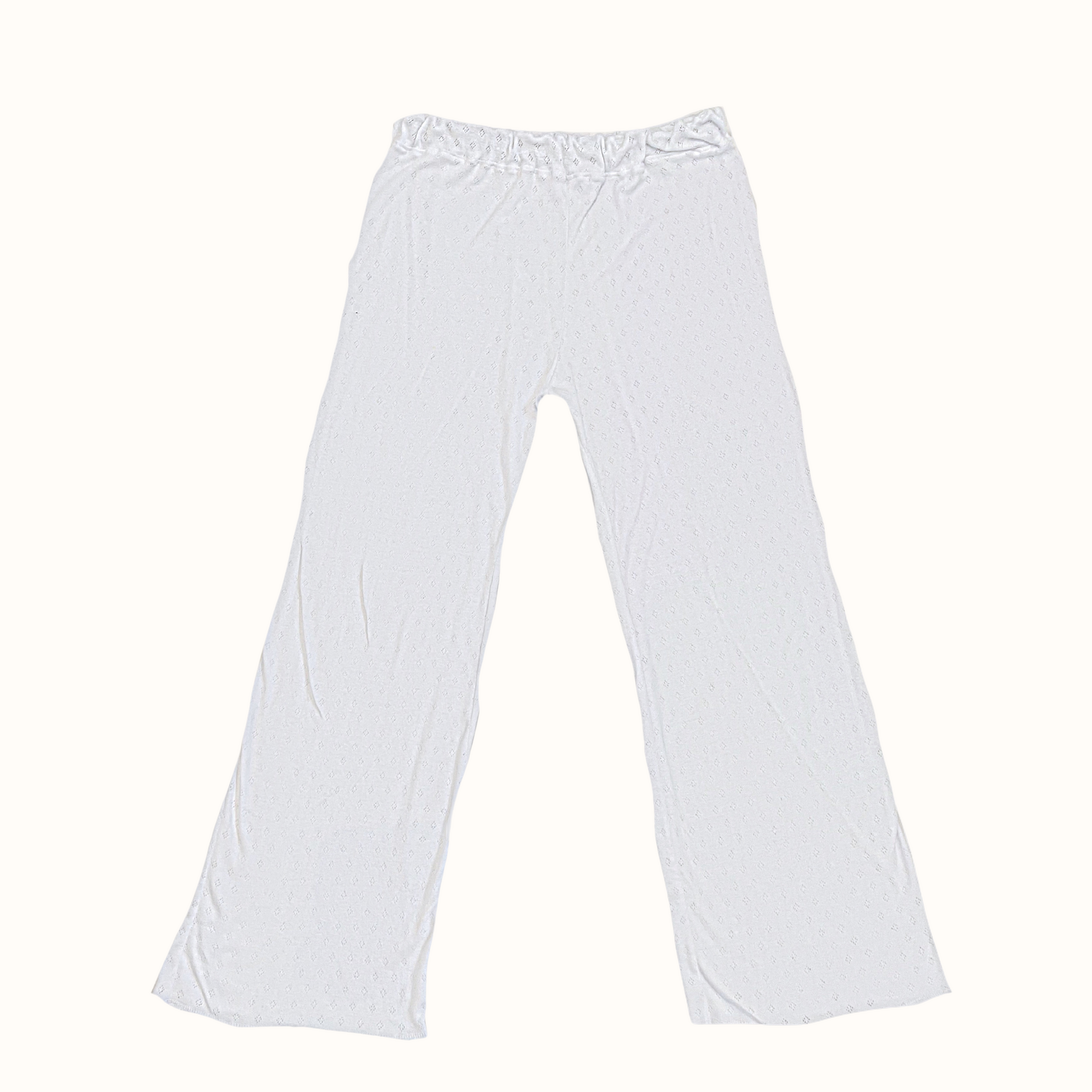 Clouds - Wide Leg Bottoms. White organic cotton pointelle fabric, white detailed stitching and logo at back. Loose wide leg fitted pants can be worn low or mid rise. Designed for comfort.