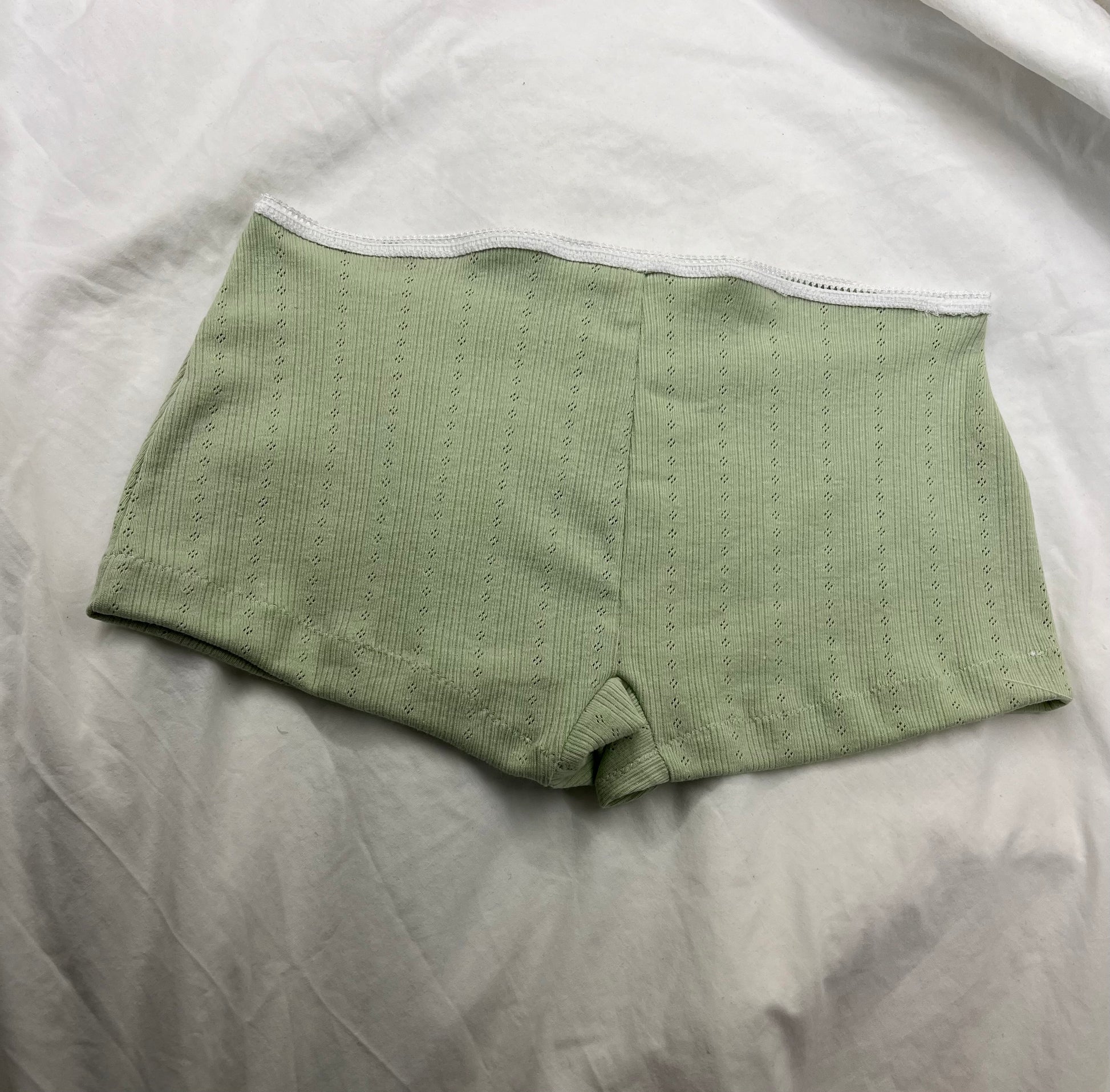 Fern Mini Shorts. Striped cotton pointelle with white bow and picot edge elastic.