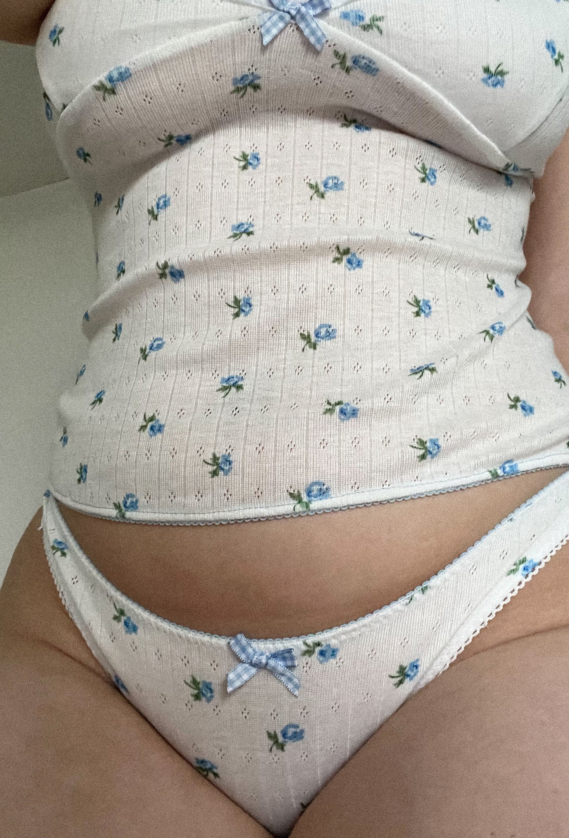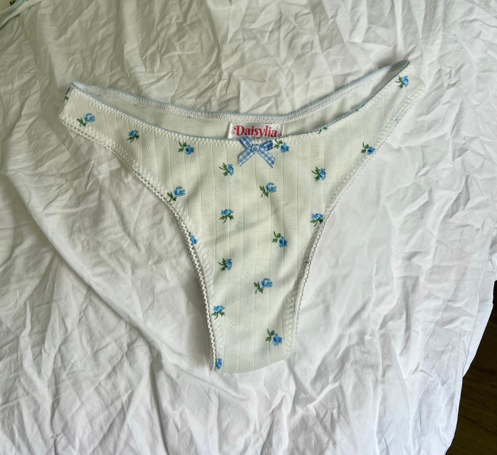 Harmony Ivie Thong. White soft comfortable jersey pointelle with blue flora print and blue gingham bow. Standard rise of thong. (Back of Ivie Thong shown in image 3).
