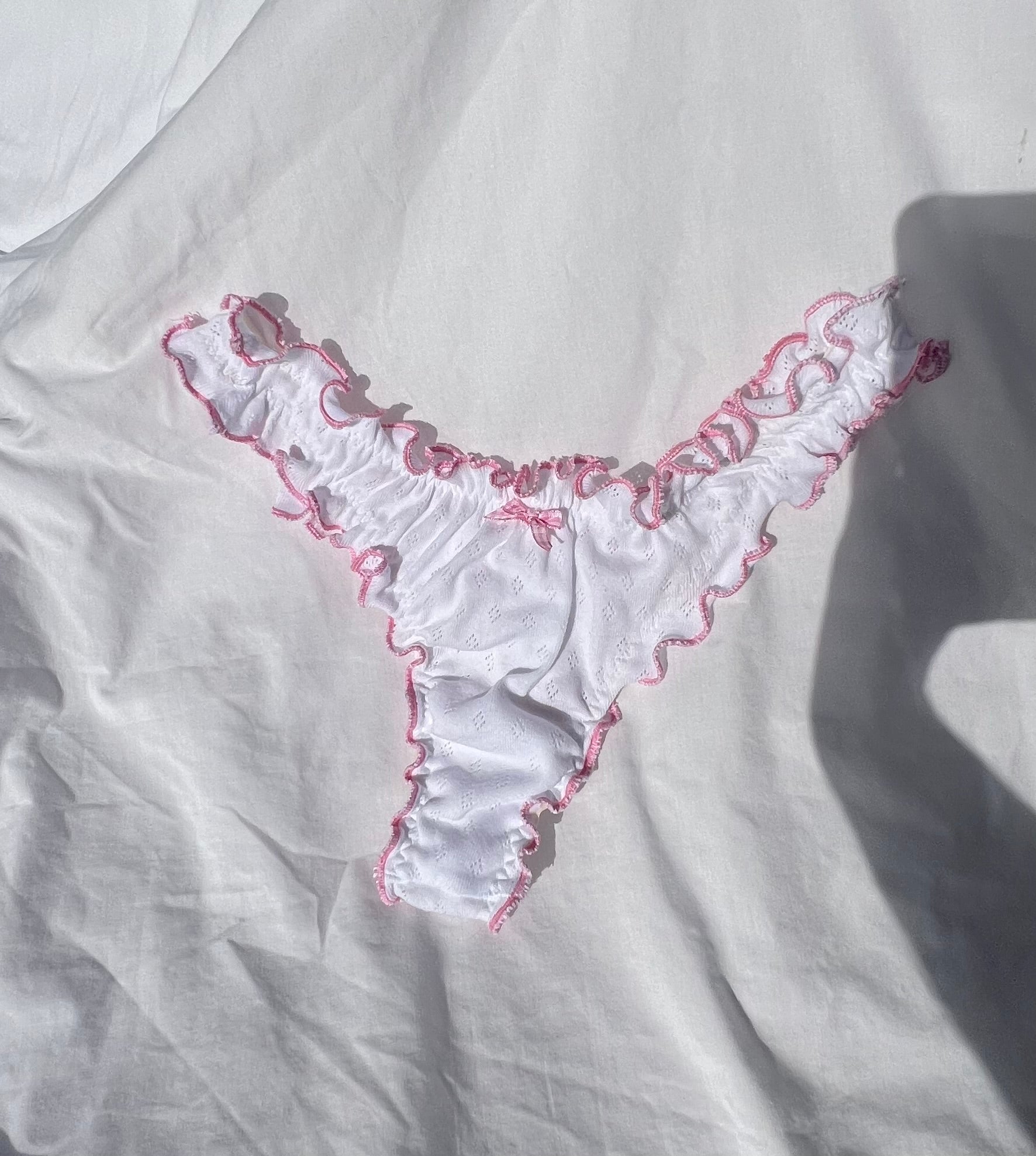 Pink Clouds Ruffle Thong. White 100% organic cotton pointelle jersey, pink detailed ruffle stitching and a pink gingham bow.