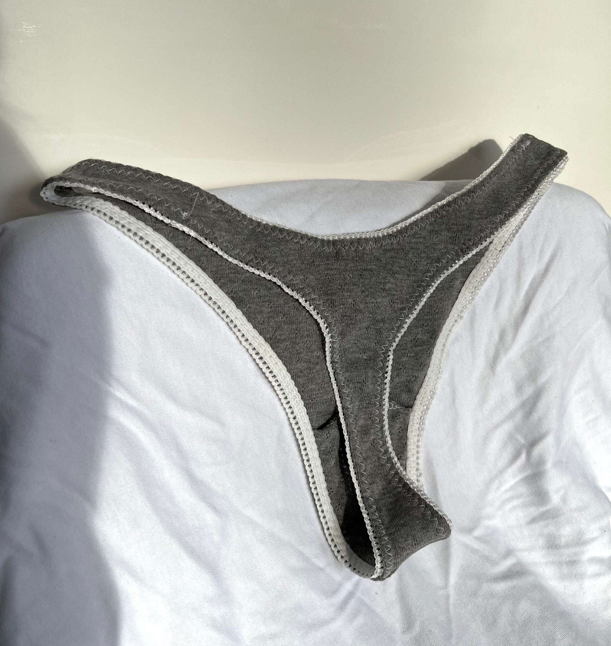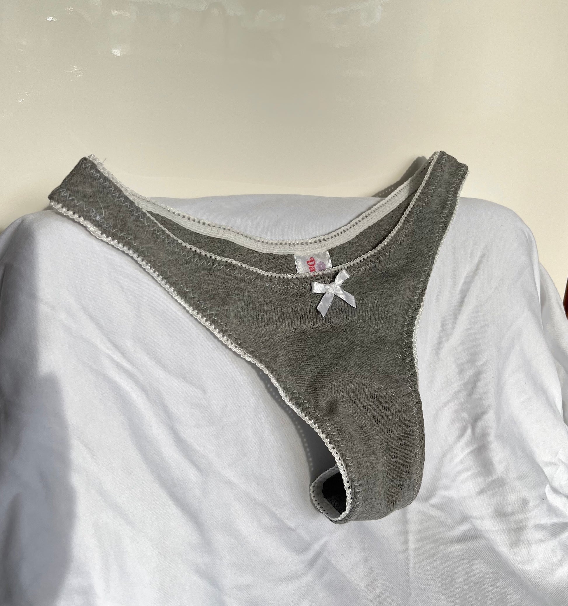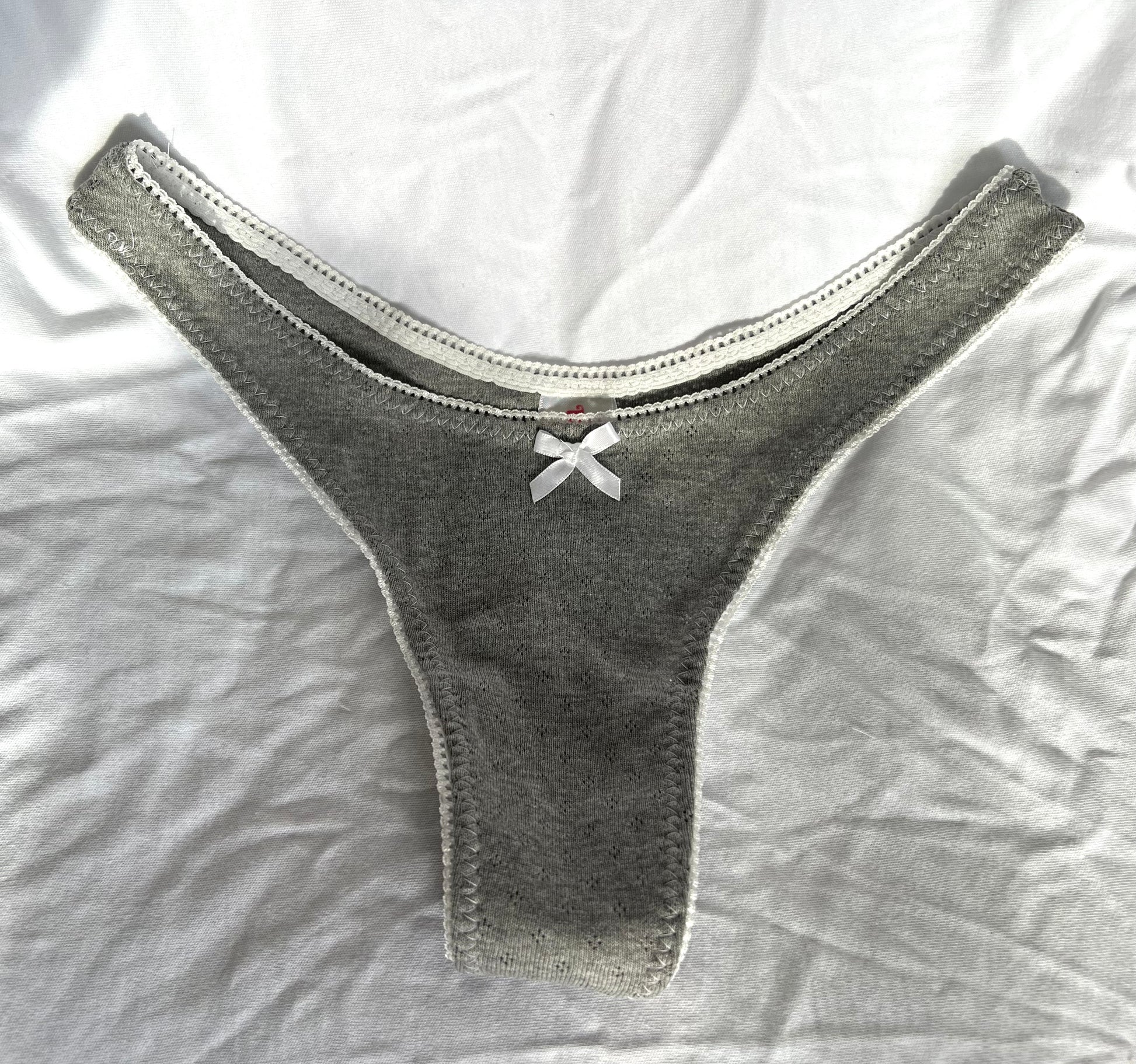 Lunar - Ivie Thong. Grey pointelle thong with white picot edge elastic and white bow. Standard cut of thong.