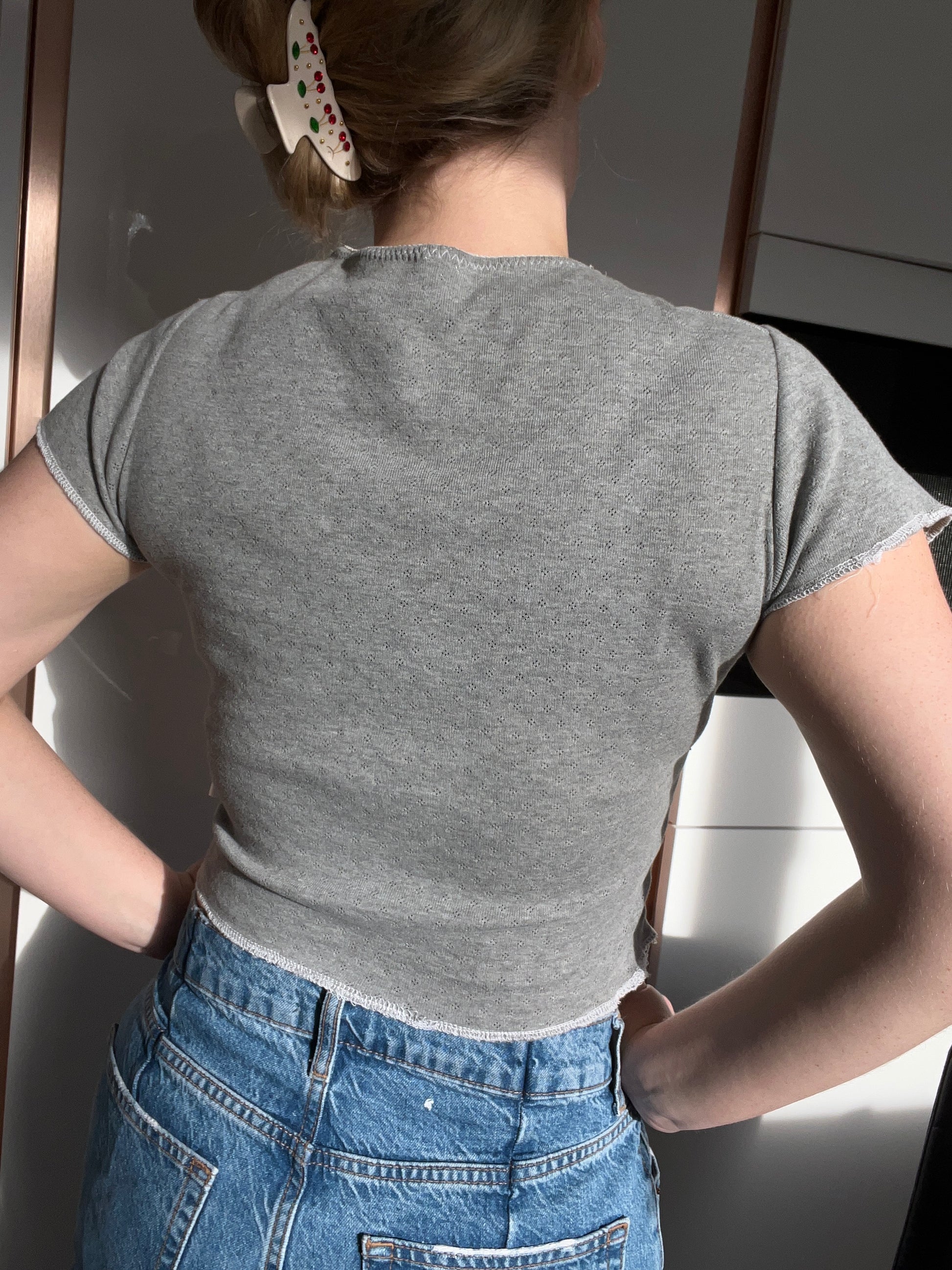 Lunar - Baby Tee. Grey pointelle baby tee with scalloped edge elastic around the neck and exposed seam around the hem, tag on the side.