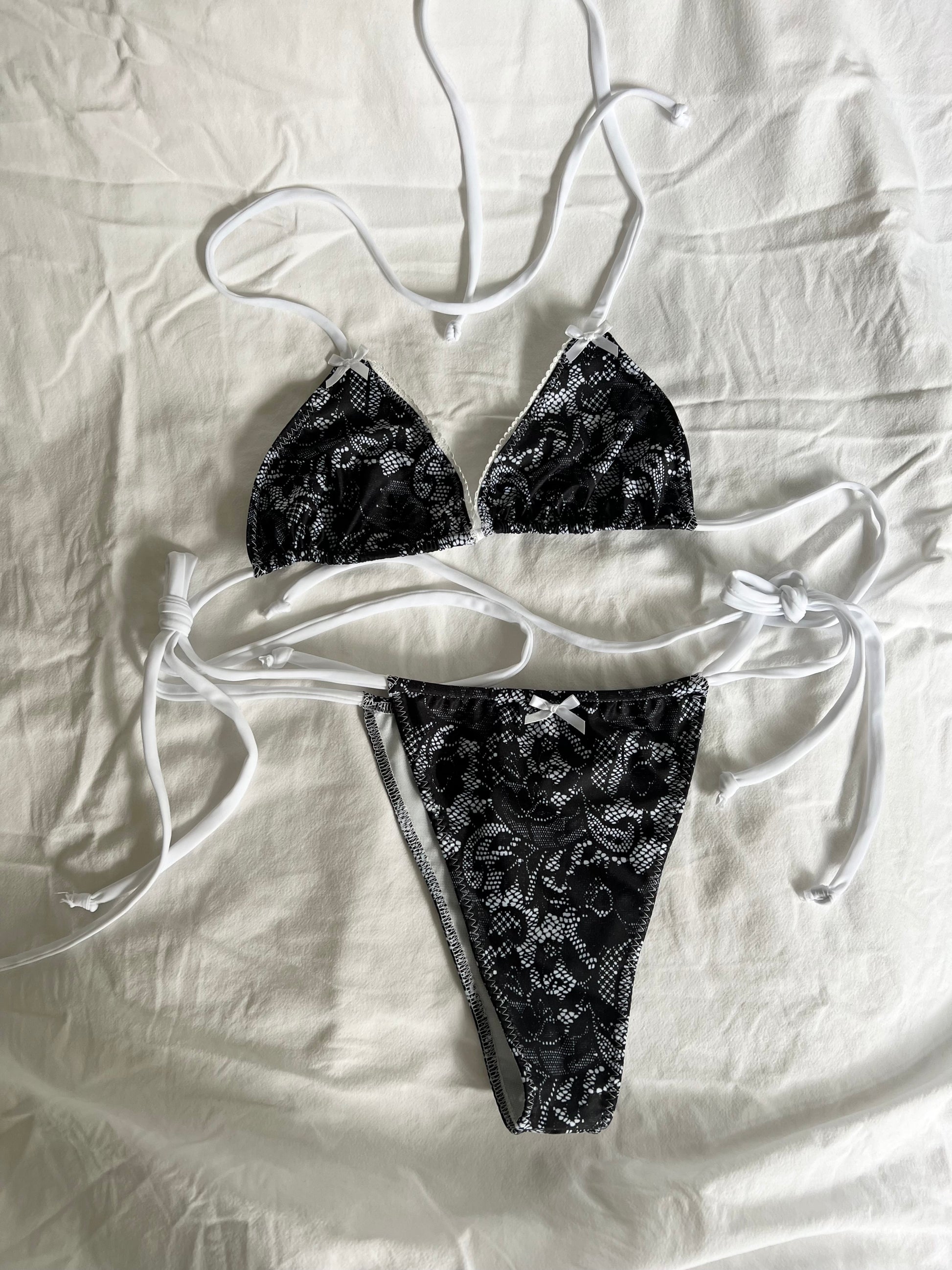 Onyx Lace - Tied Bikini Bottoms. Soft black lace printed fabric environmentally responsibly made from recycled yarn from waste material. White bows, elastic, and straps. Ties at the sides to adjust to a fit best for you. Adjustable to move across the string.