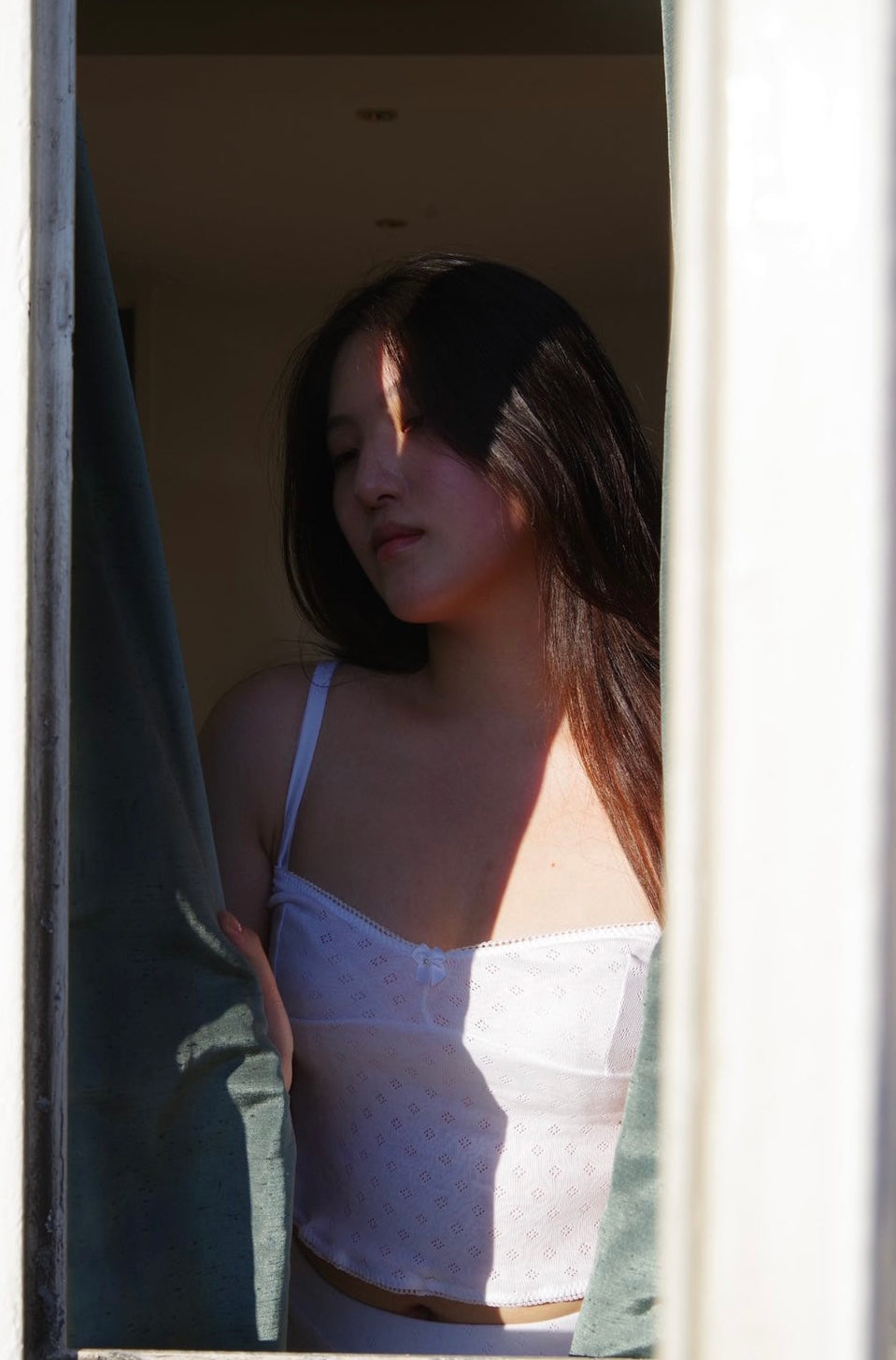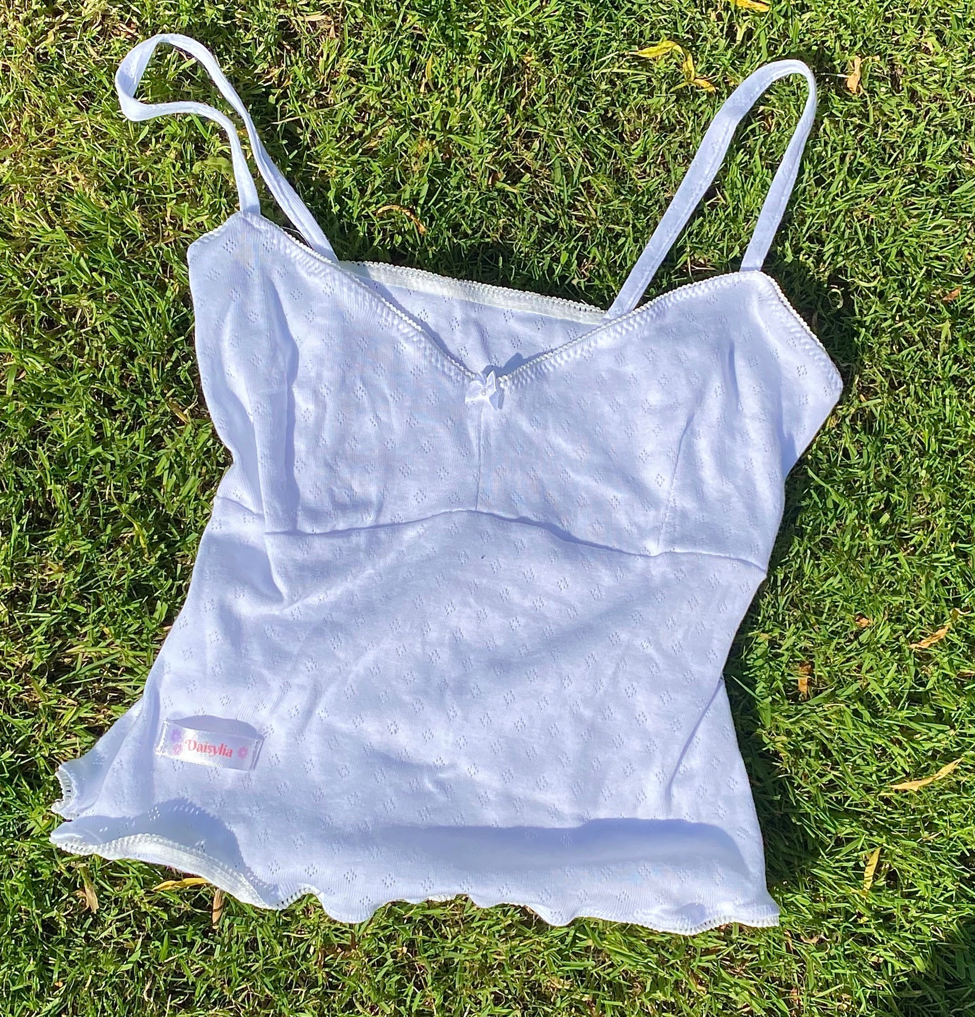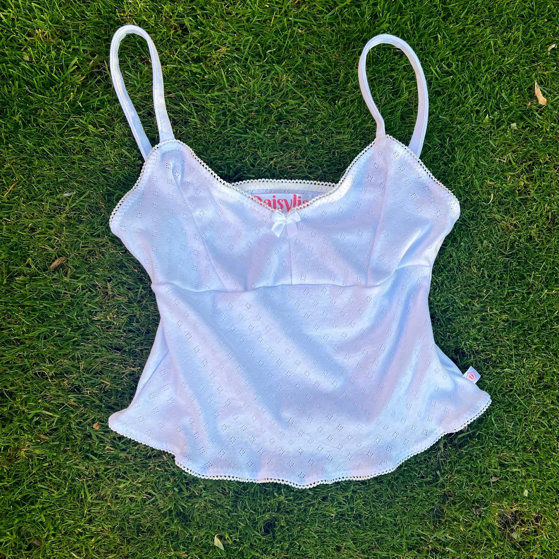 The Bella Top can be dressed up or down. This cami is made out of white 100% organic cotton pointelle.  Picot edge elastic and a white bow.