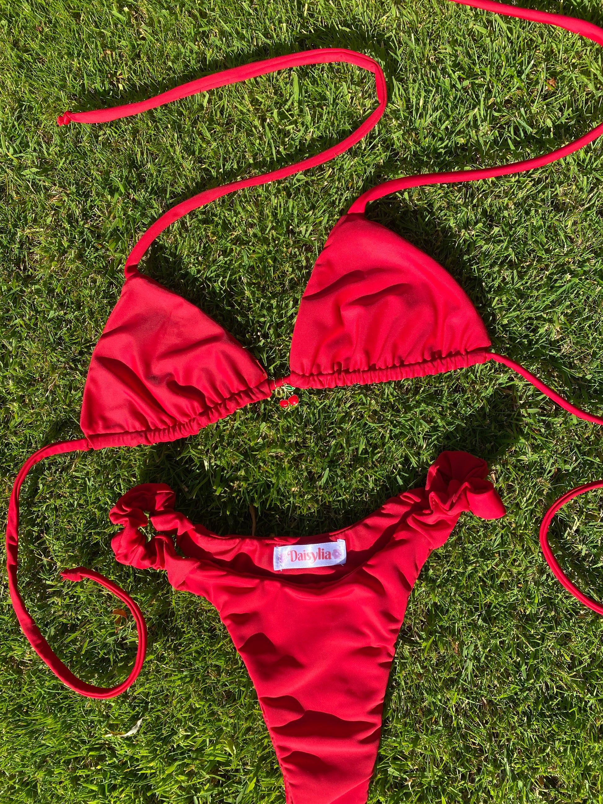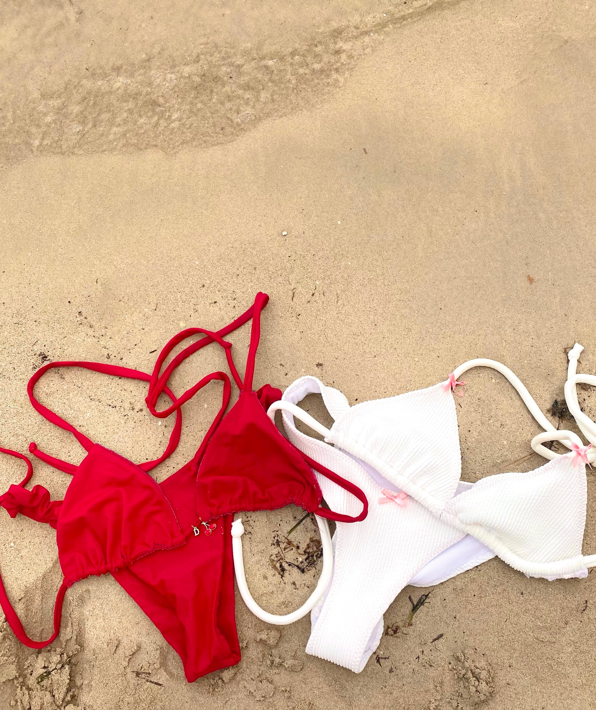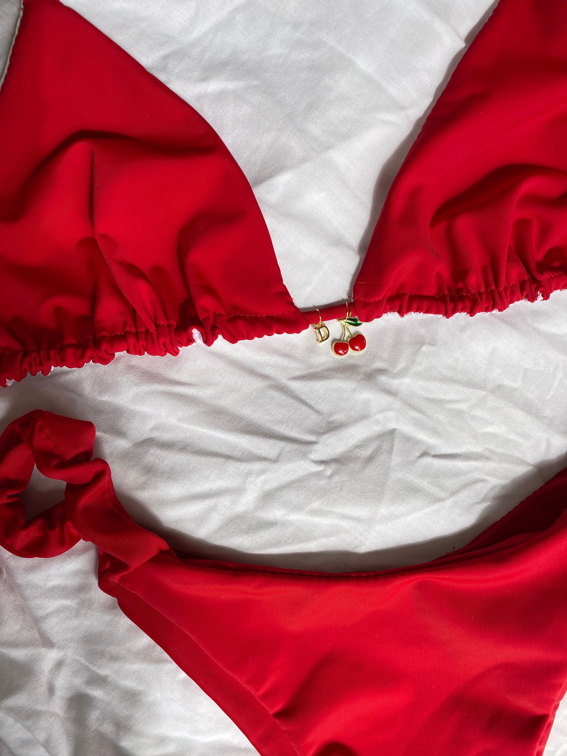 Shirley Temple Bikini Top. Soft red seamless bikini top. Tied at the back top with a 'D' and cherry charm in the centre. Double layered with elastic. Recycled fabric made from discarded materials that were 100% nylon (such as nets and tulle). Buy the top or bottoms separately.