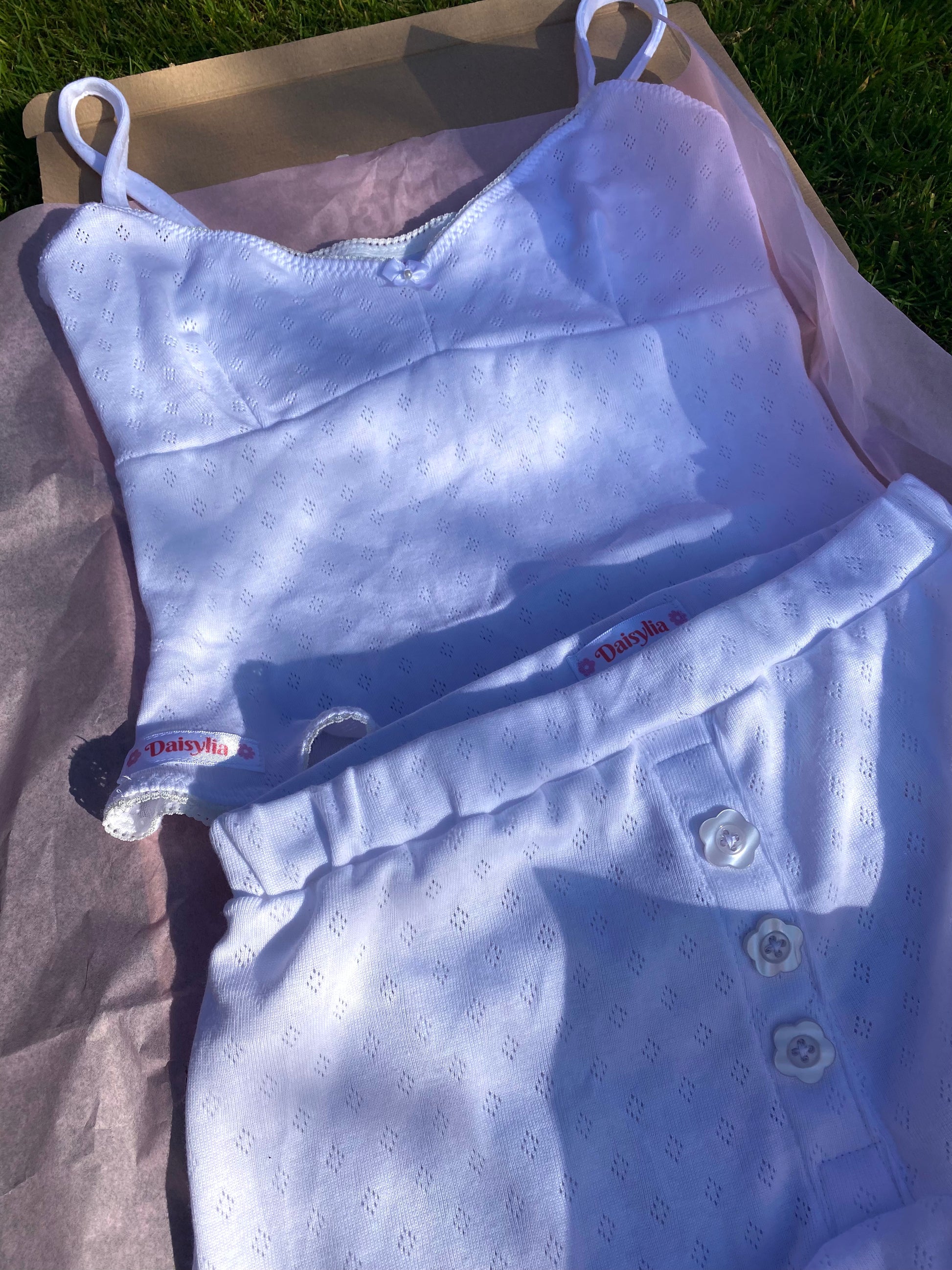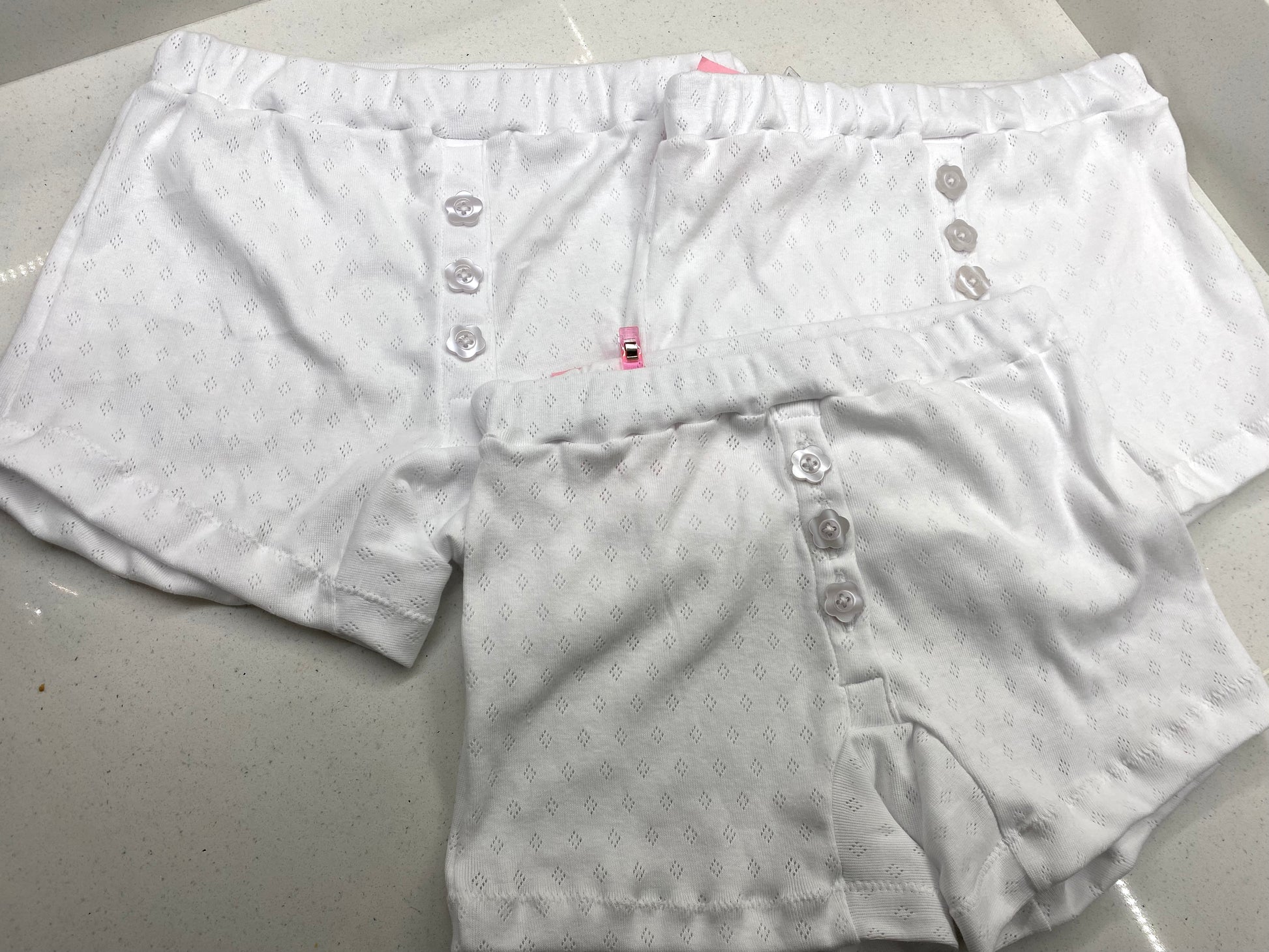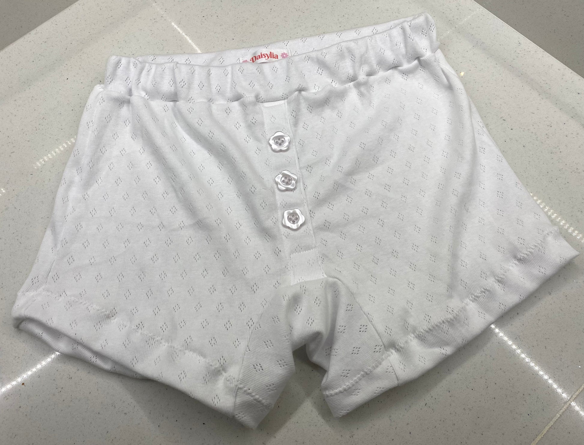 Organic cotton white pointelle with three flower buttons and an elasticated waistband - enter your waist measurements in inches - and size up or down depending on if you prefer a looser or tighter fit.