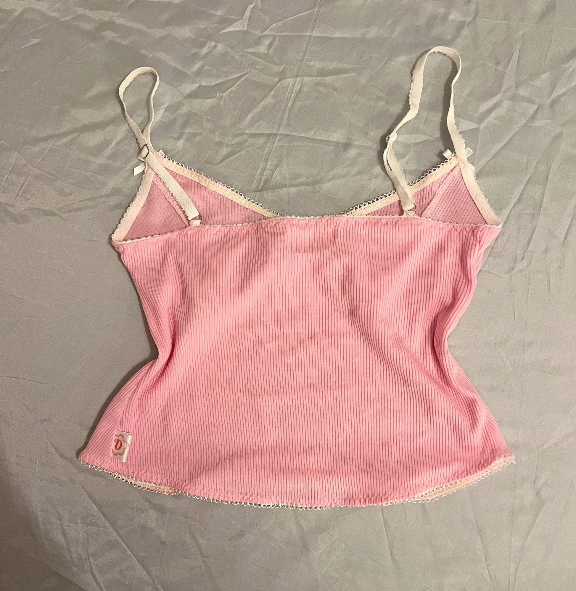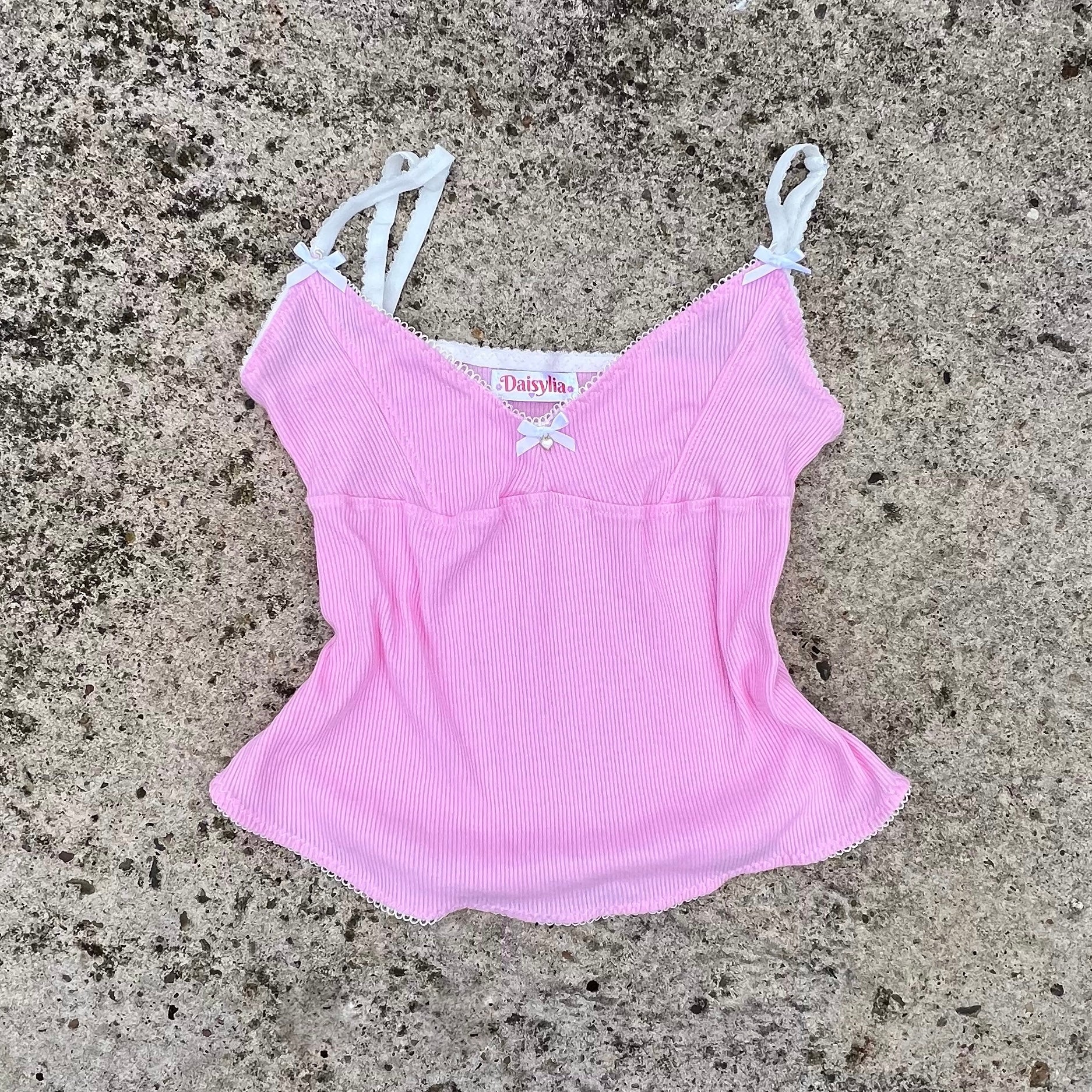 The Pink Bella Top. She can be dressed up or down, this cami is made out of pink rib stretch jersey fabric with white elastic, stitching and bows with a white charm. Straps are adjustable. Cups are double lined.