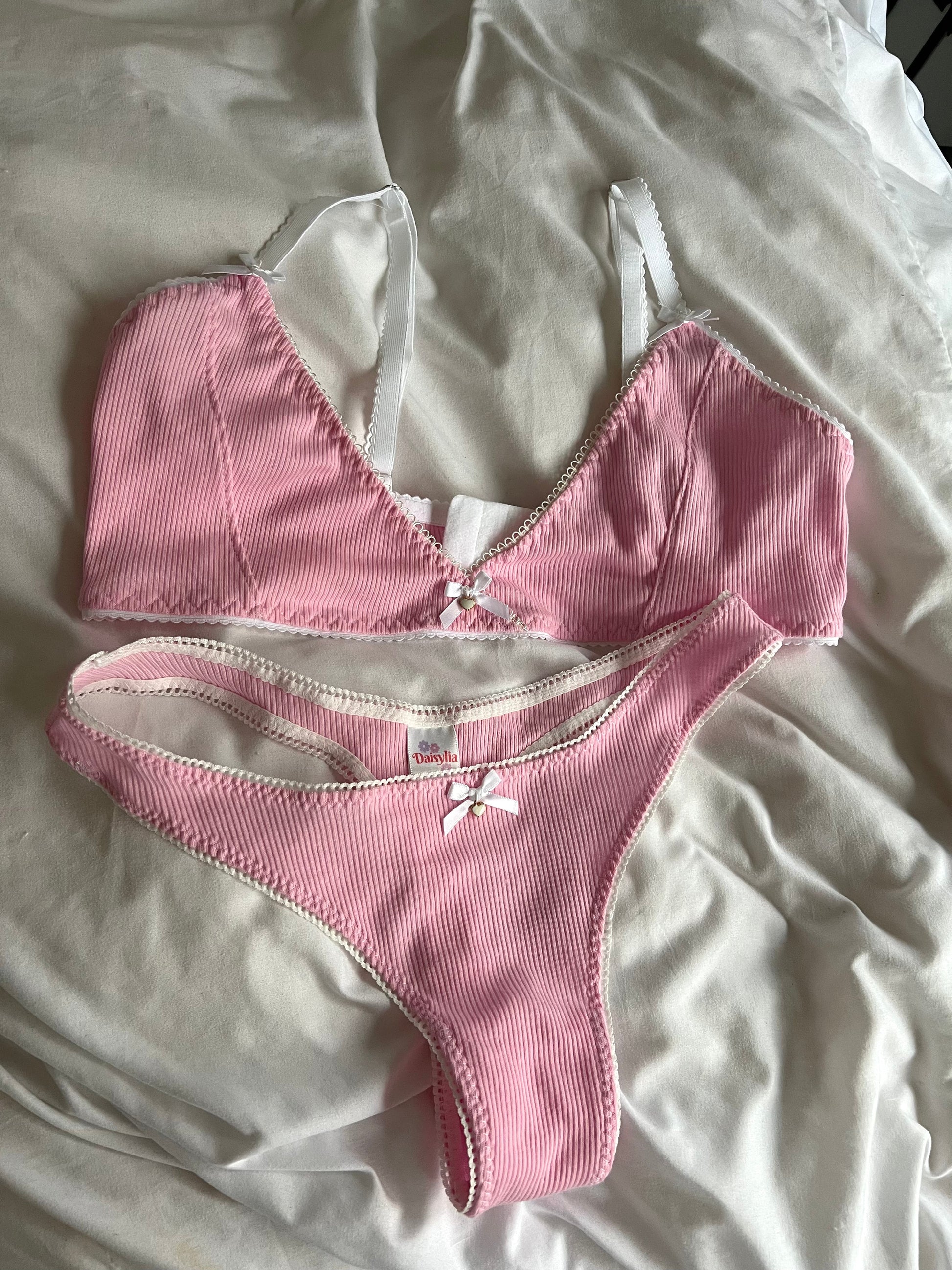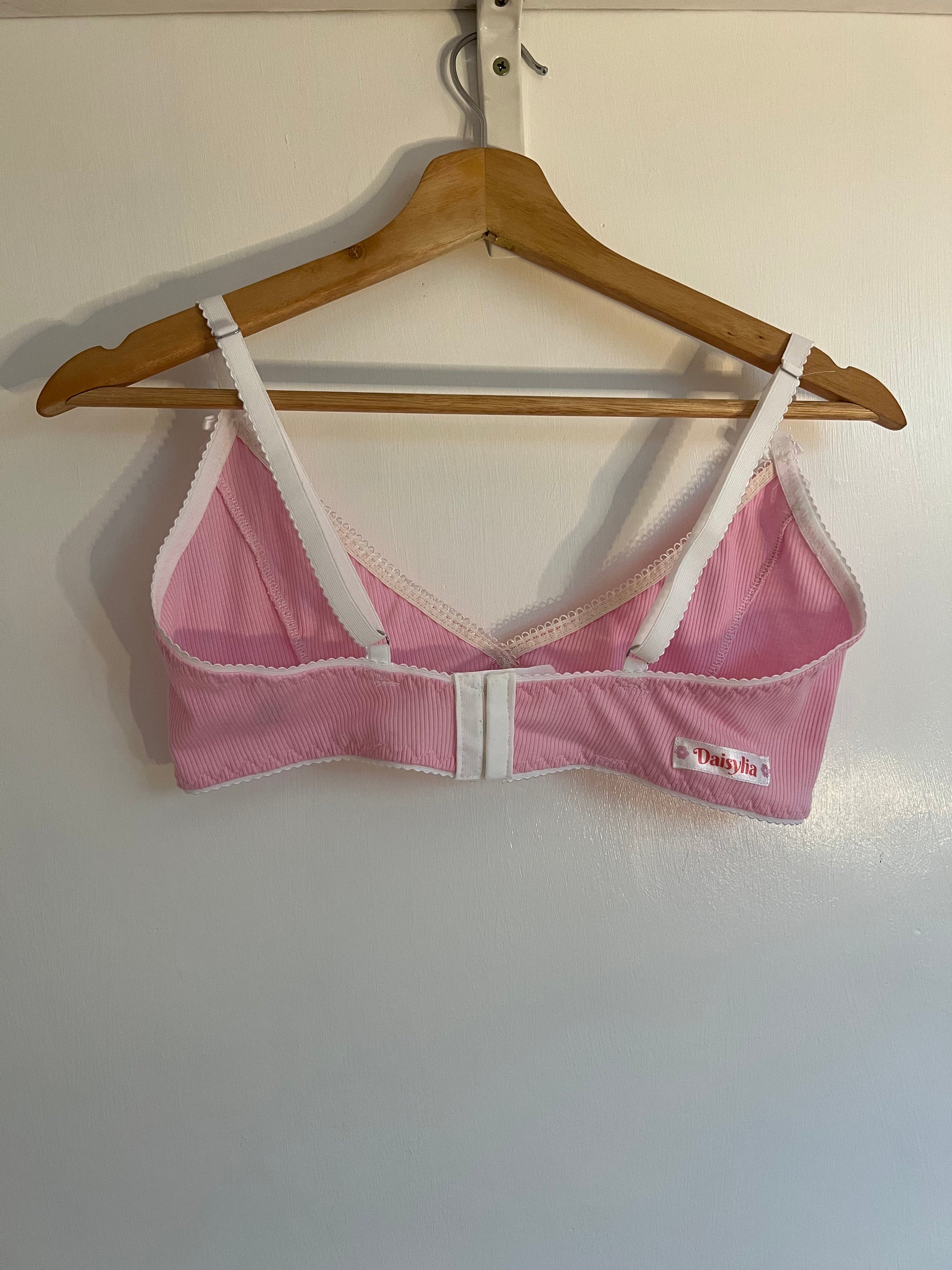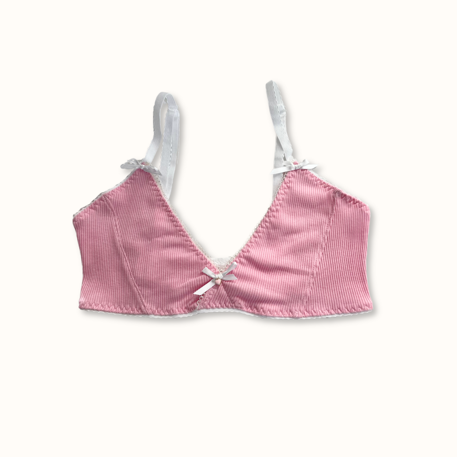 The Pink  Bralette. Pink Ribbed Jersey with white elastic, bow and little heart charm. Adjustable straps and back. Label on the side.
