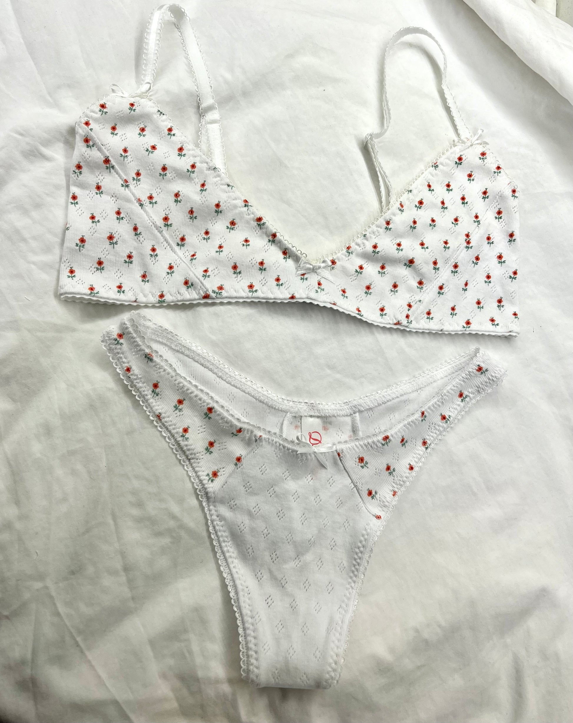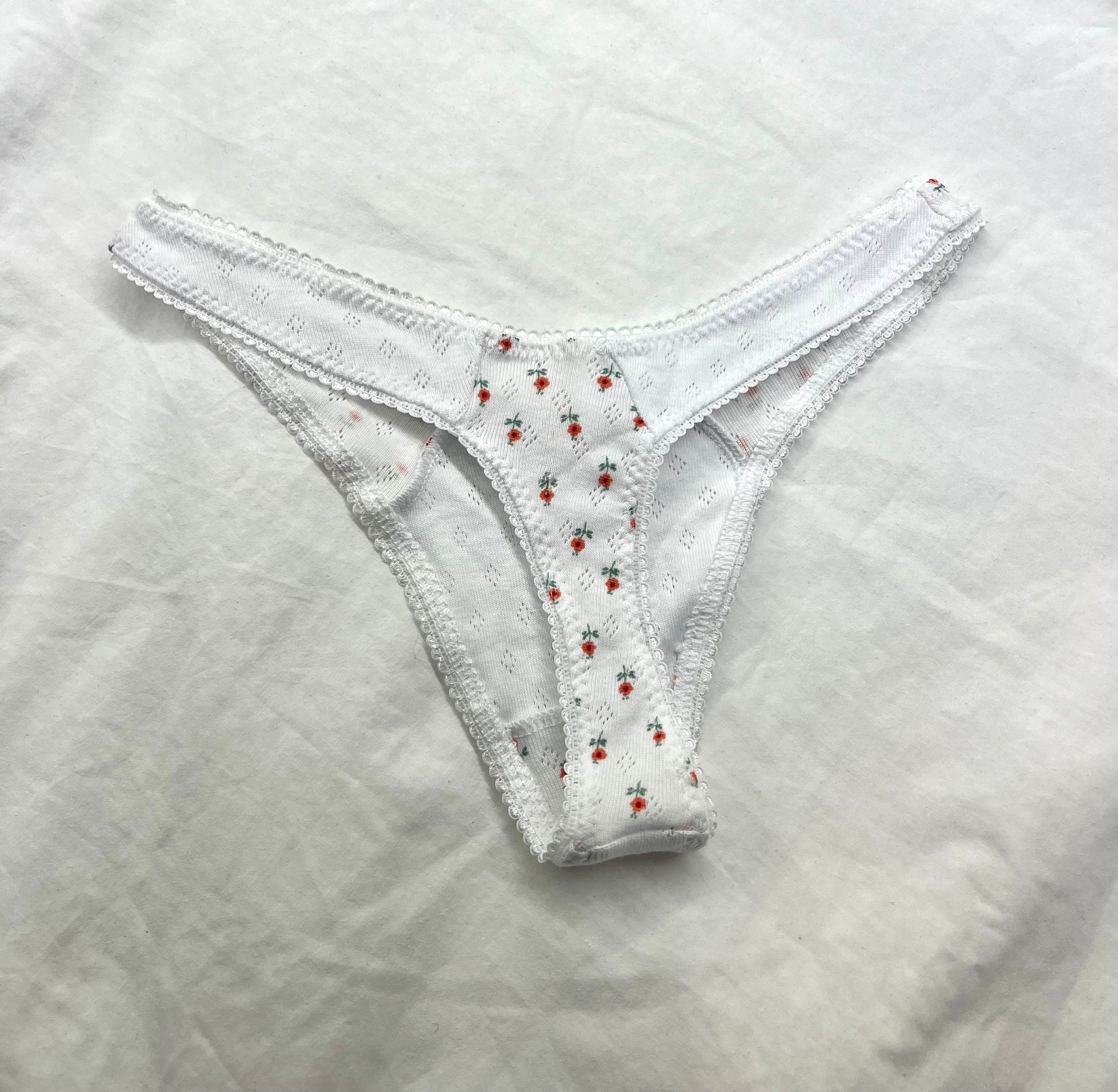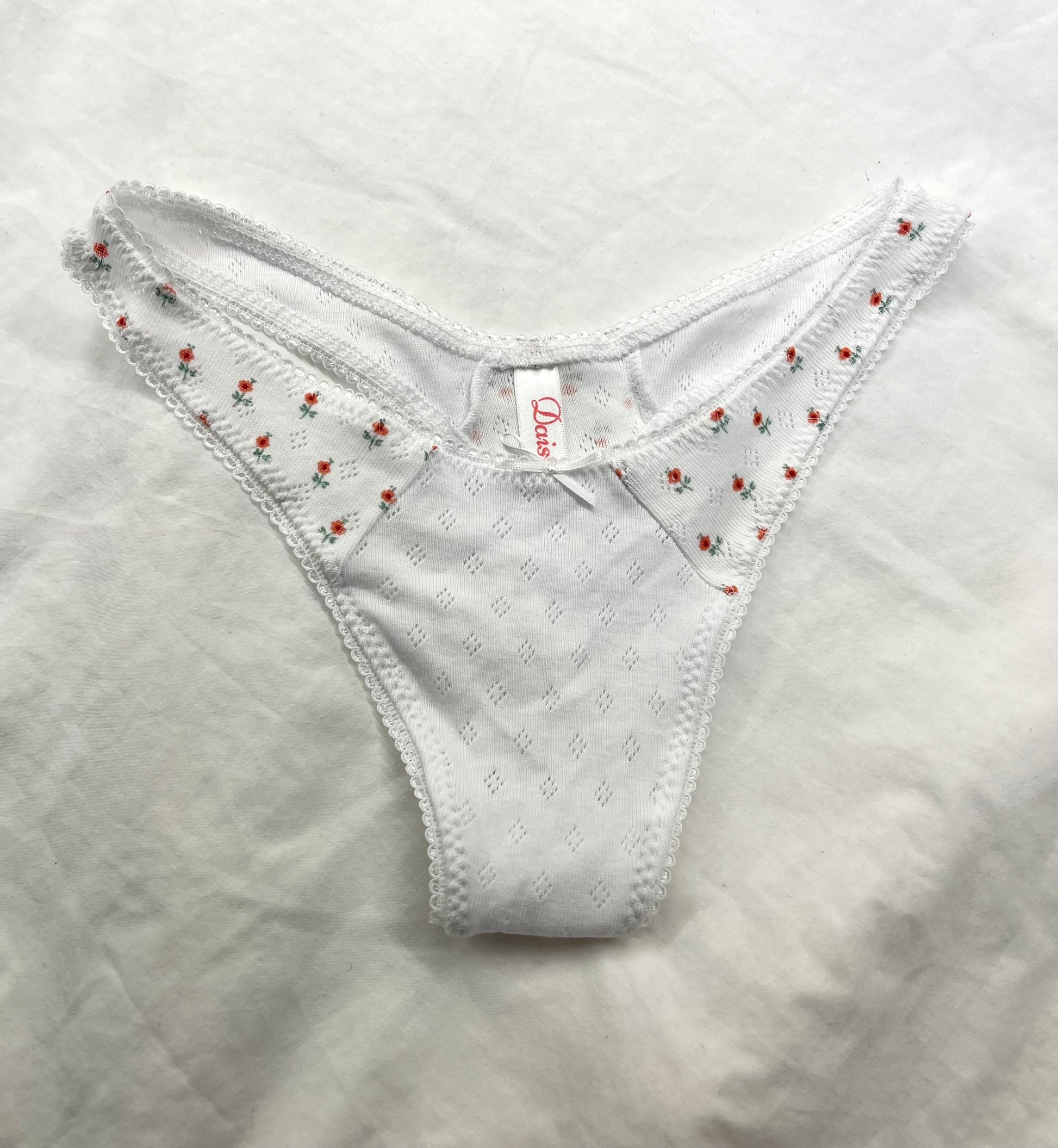 True Love Ivie Thong. White soft comfortable pointelle jersey fabric , white elastic and bow. Standard Thong cut.
