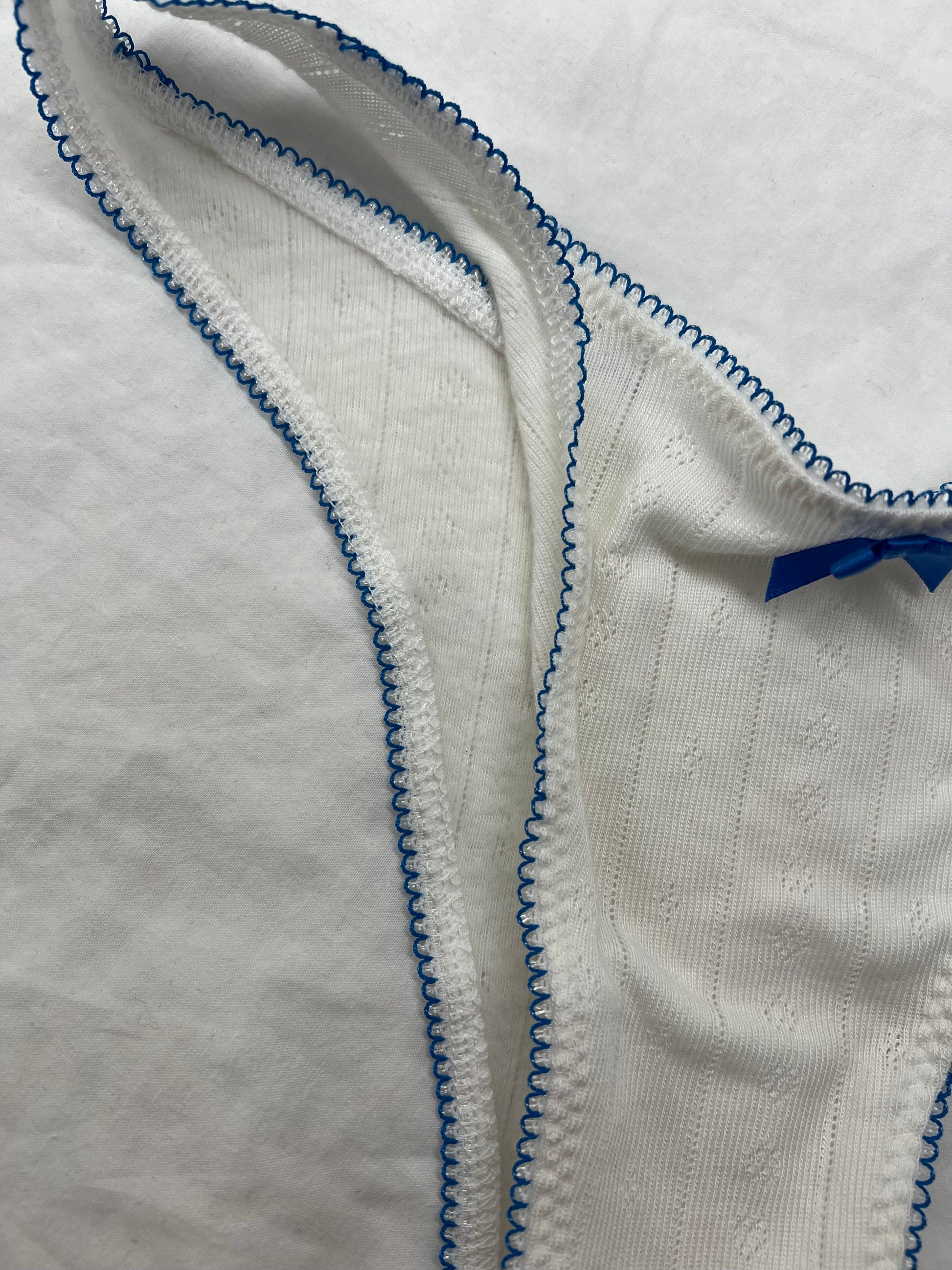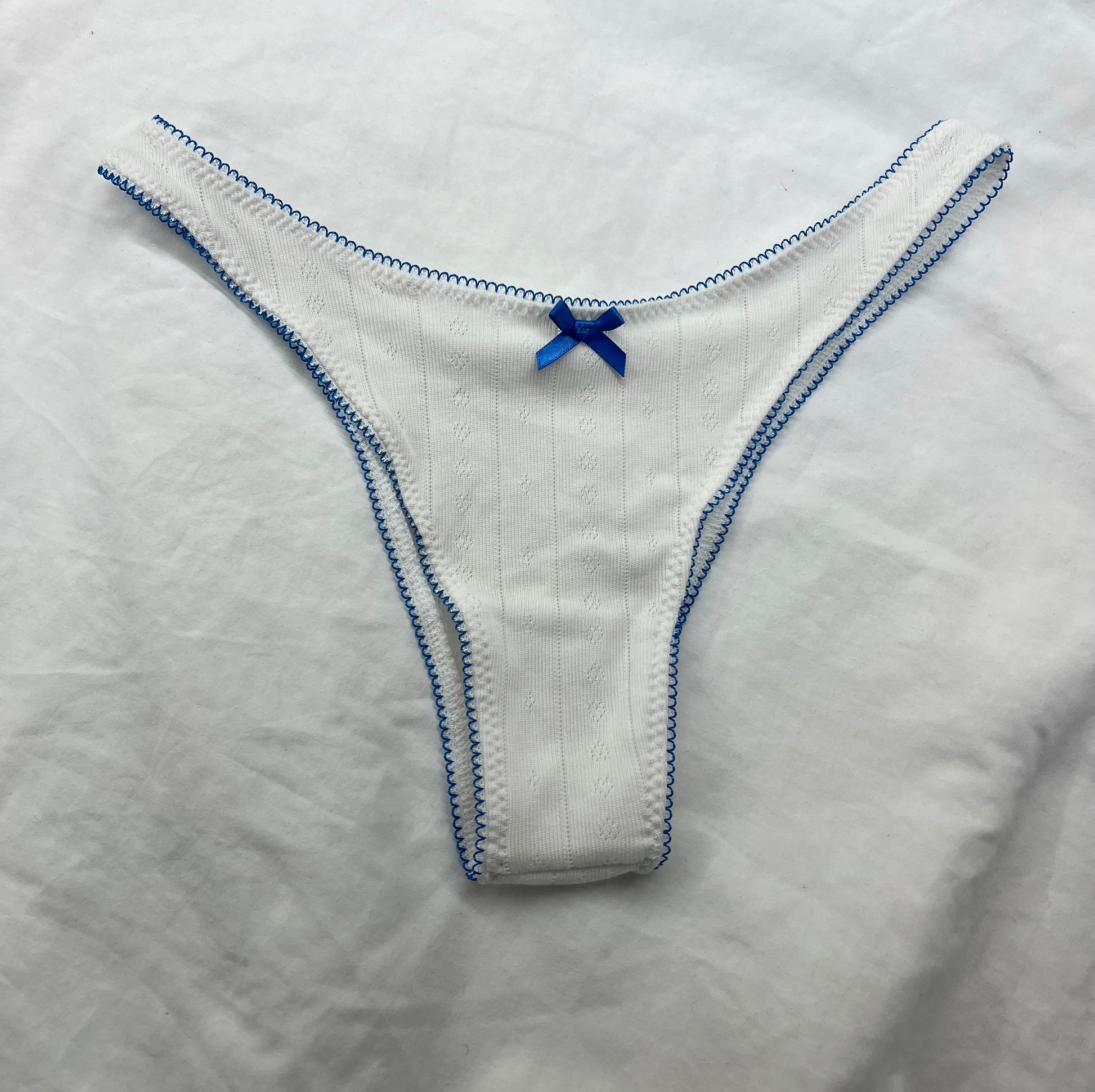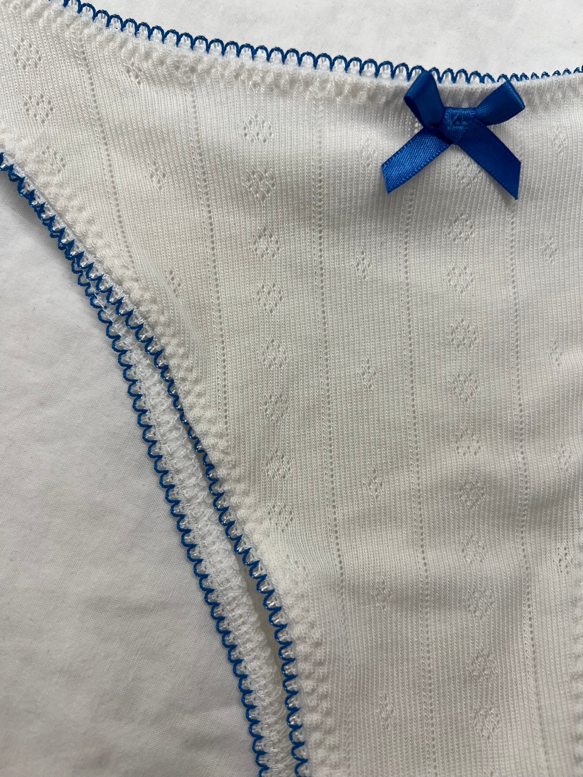 Vanilla - Gracie Knicker. Cream striped heart pointelle with blue picot edge elastic and a blue bow. Tanga cut of knicker, in between less and full coverage.