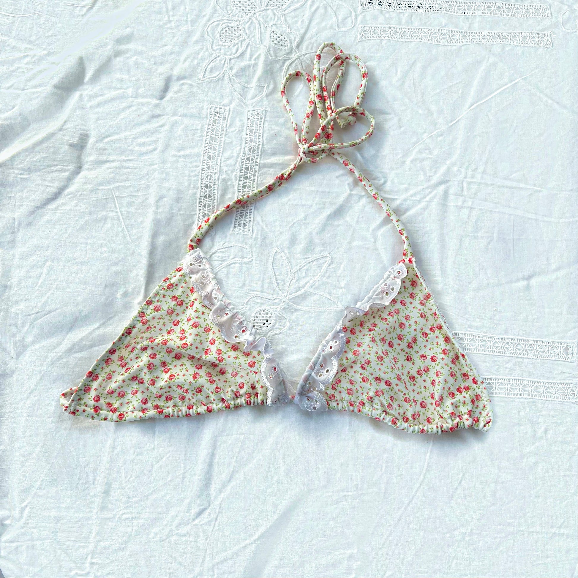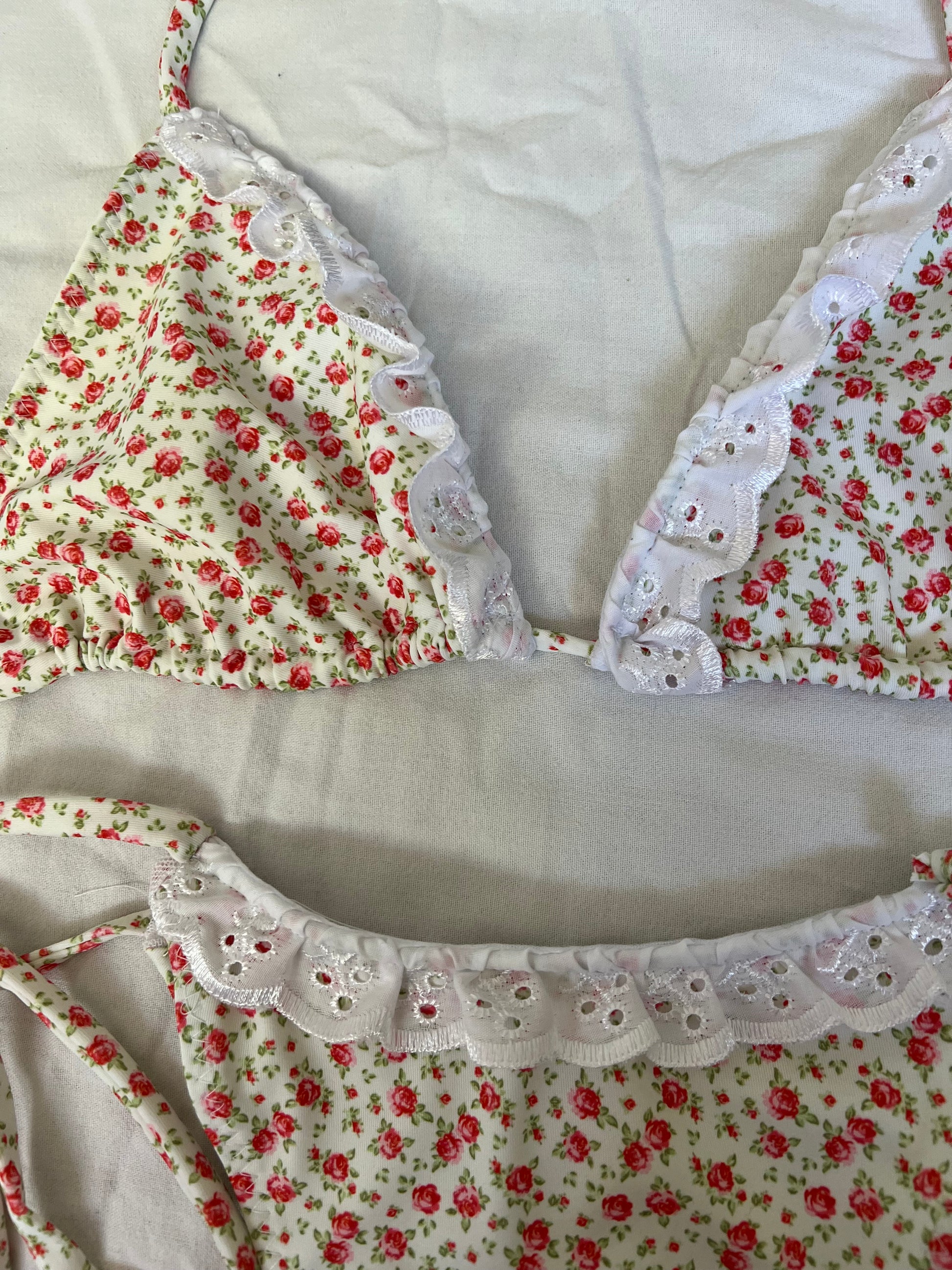 Wild Dreams Bikini. Floral printed fabric environmentally responsibly made from recycled netting. Cotton broderie ruffles. The top ties at the back and neck.
